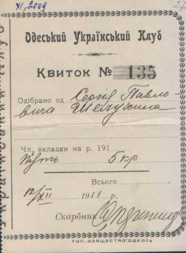 42. Одеський Український клуб. Квиток про сплату членських внесків Шелухиним Сергієм Павловичем. Одеса, 12 грудня 1911 р. (ІР НБУВ, ф. ХІ, од. зб. 2009)