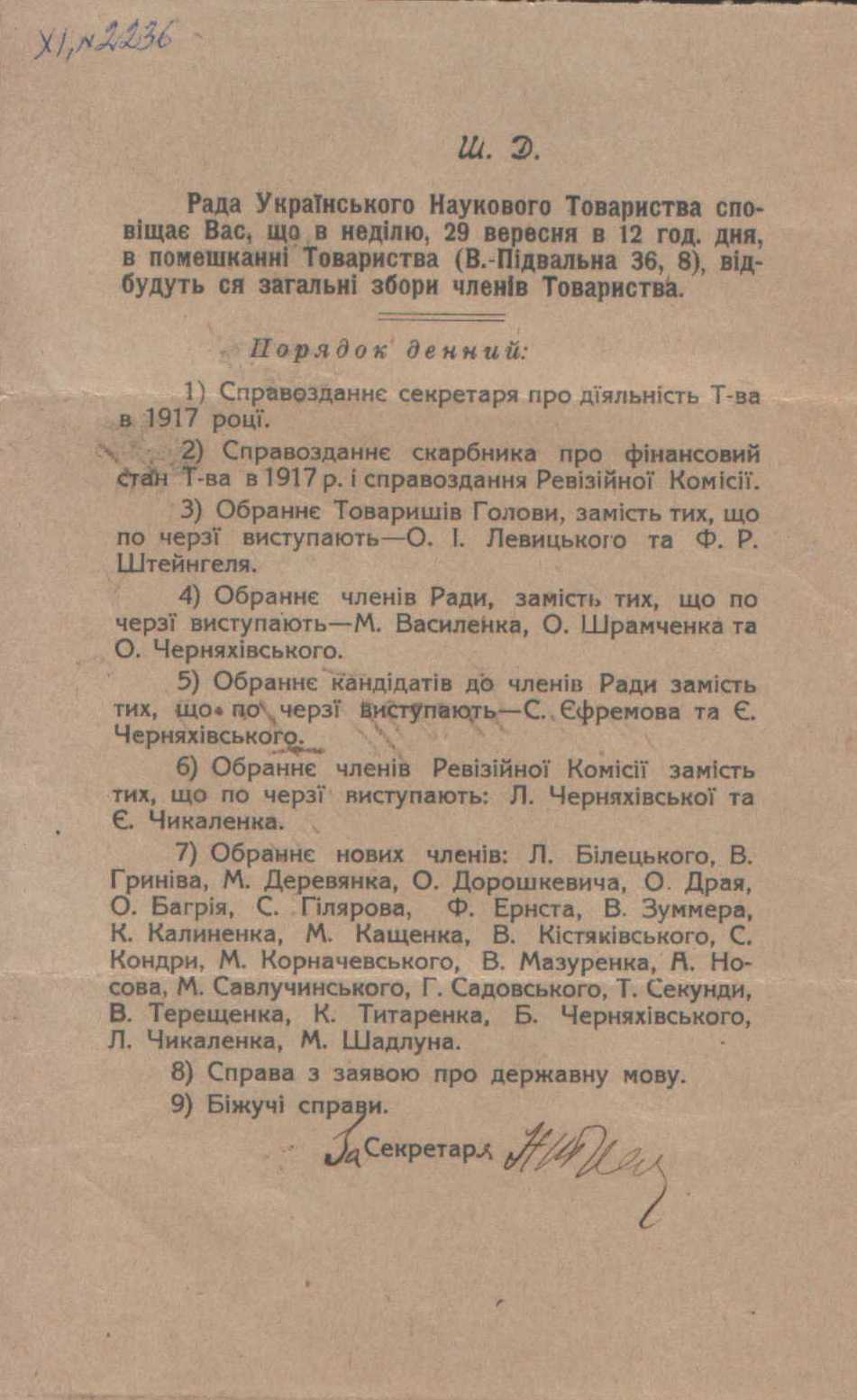 50. Порядок денний Загальних зборів Українського наукового товариства у Києві на 29 вересня 1917 р. Згадуються: О.І. Левицький, Ф.Р. Штейнгель, М.Василенко, О. Шрамченко, О. Черняхівський, Є. Чикаленко, Л. Білецький, В. Гринів, Є. Гіляров, Ф. Ернст, В. Зуммер, М. Кащенко, В. Кістяківський, С. Кондра, А. Носів та ін. На документі підпис секретаря товариства Н. Ткаченко. [Київ, 1917 р.] (ІР НБУВ, ф. ХІ, од. зб. 2236)