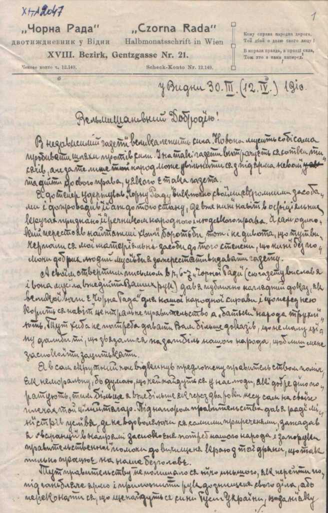 39. Тавонович Іван, видавець україномовного двотижневика «Чорна рада» у Відні – [Шелухину Сергію Павловичу]. Лист про складнощі у виданні незалежної від дотацій уряду патріотичної проукраїнської газети. Відень, 30 березня 1910 р. 2 арк. (ІР НБУВ, ф. ХІ, од. зб. 2047)
