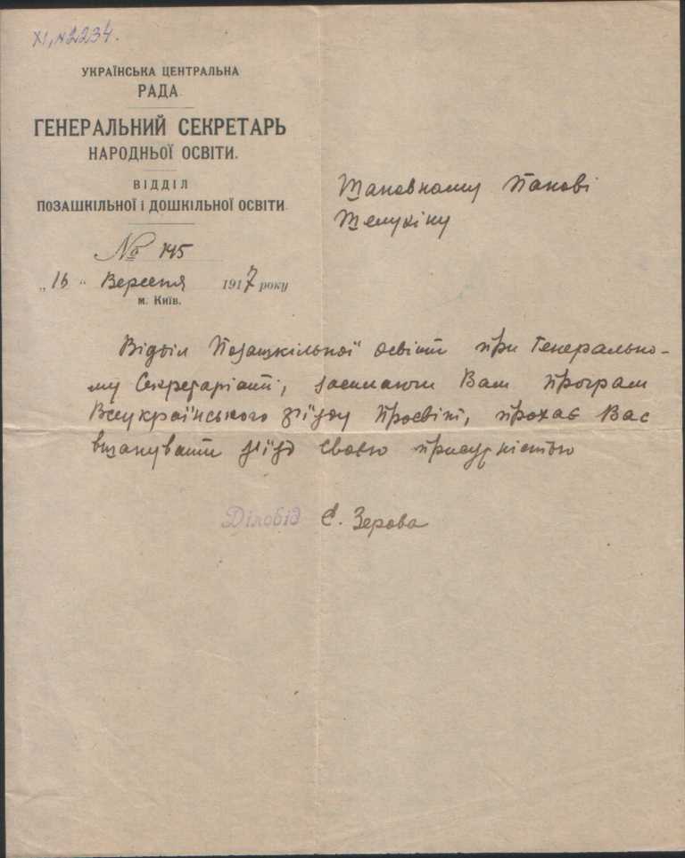 51. Українська Центральна Рада. Генеральний секретар народної освіти. Відділ позашкільної і дошкільної освіти. Запрошення С.П. Шелухину на Всеукраїнський з’їзд товариства «Просвіти». 16 вересня 1917 р. На документі підпис діловода відділу – Софією Зеровою (ІР НБУВ, ф. ХІ, од. зб. 2234)