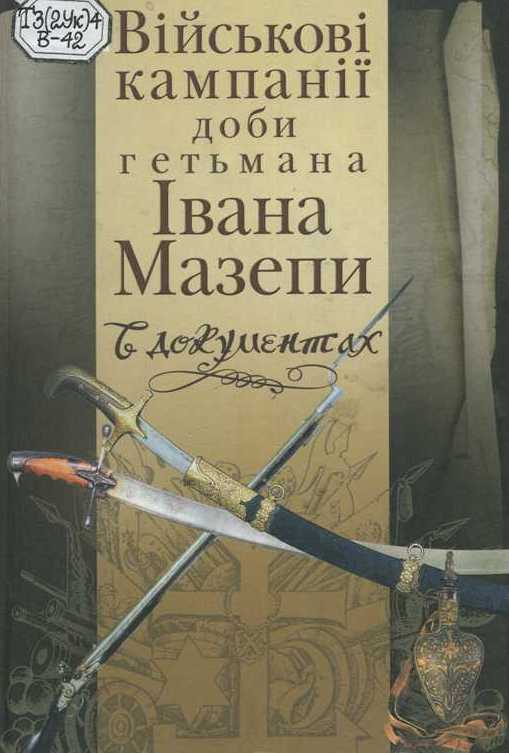 4. Військові кампанії доби гетьмана Івана Мазепи в документах [Текст] / упоряд. С. Павленко ; відп. ред. С. Леп'явко ; Укр. ін-т нац. пам'яті, Черніг. іст. музей ім. В. В. Тарнавського, Сівер. ін-т регіон. дослідж., Ін-т рукопису Нац. б-ки України ім. В. І. Вернадського. - К. : ВД "Києво-Могилянська академія", 2009. - 1056 с. - (Серія "Джерела" ; т.2).