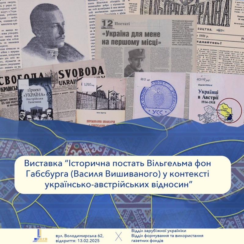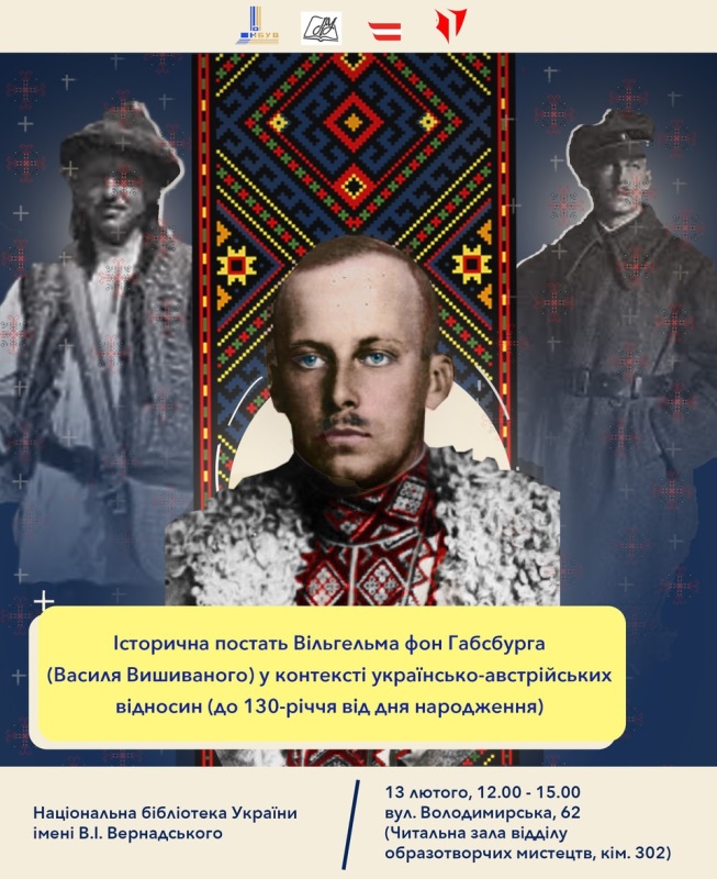 13 лютого 2025 року о 12.00 у Національній бібліотеці України імені В. І. Вернадського (вул. Володимирська, 62, читальна зала відділу образотворчих мистецтв, кімната 302) відбудеться Міжнародна панельна дискусія «Історична постать Вільгельма фон Габсбурга (Василя Вишиваного) в контексті українсько-австрійських відносин» (до 130-річчя від дня народження).
