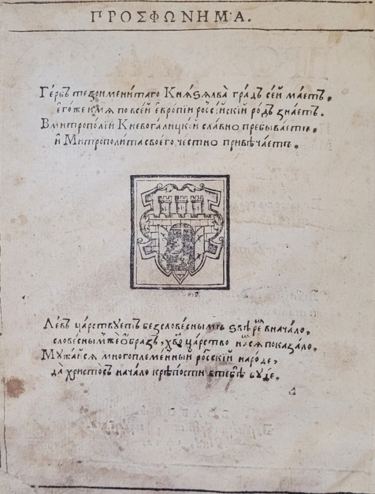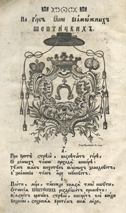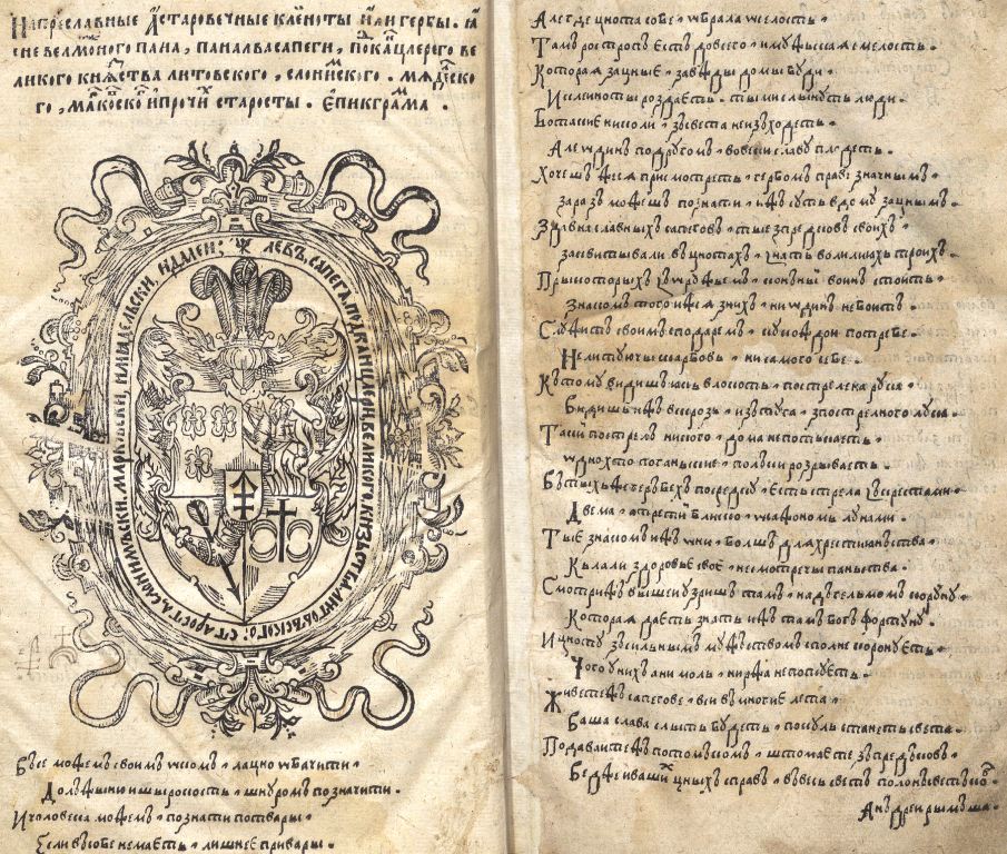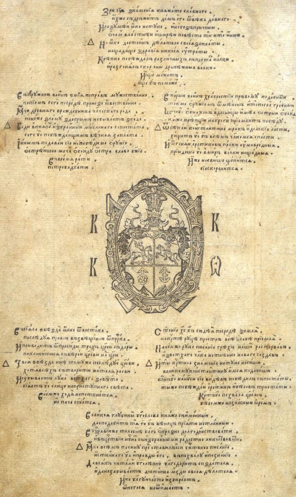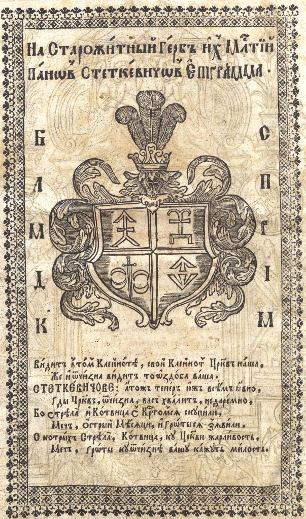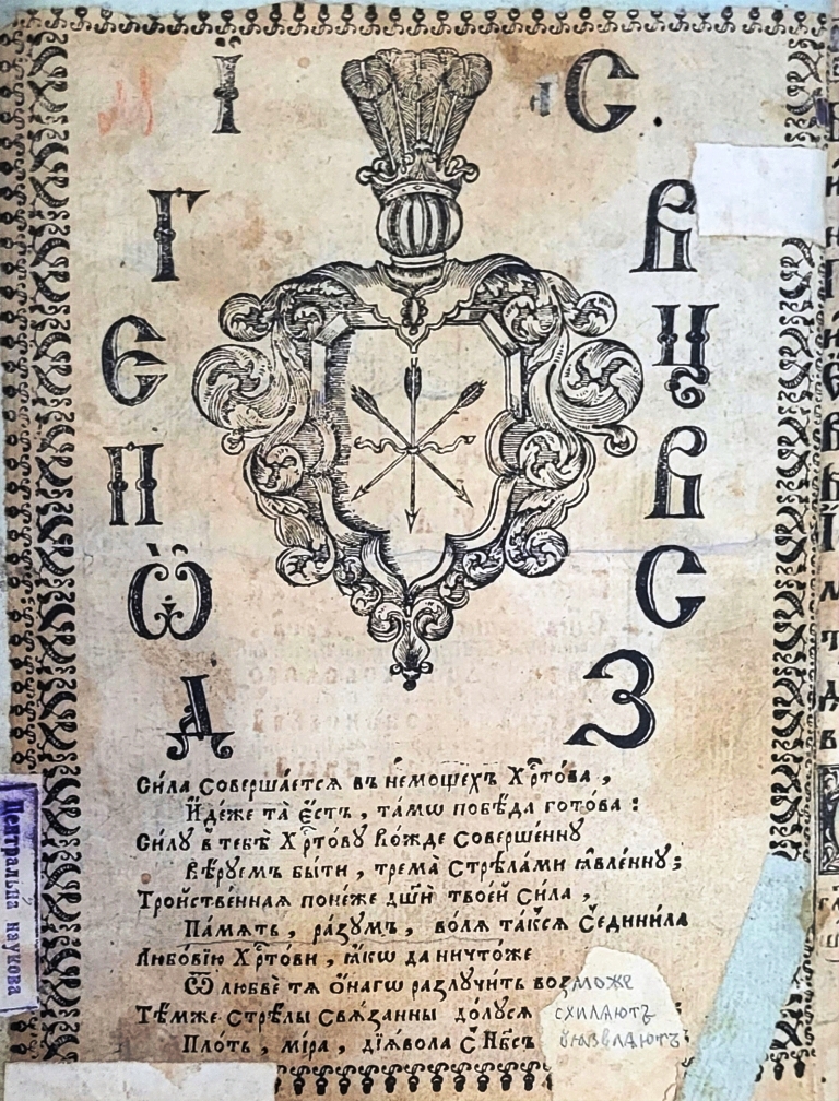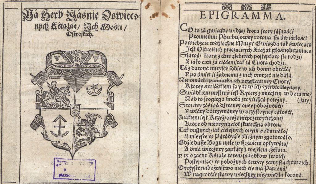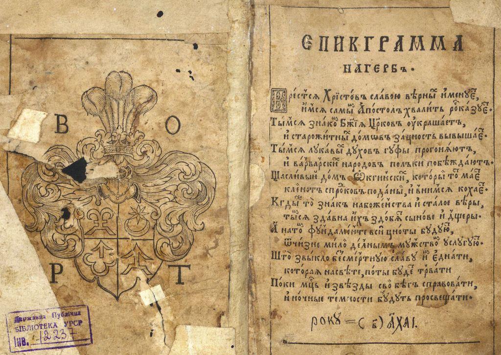Геральдична поезія – жанр української літератури ранньомодерної доби, зародження та розвиток якого тісно пов’язаний з практикою книгодрукування. Відсутність централізованого фінансування видавничих підприємств, що діяли на теренах України в XVI–XVIII ст., спонукало друкарів до пошуку меценатської підтримки. Прикрашання книг зображеннями гербів заможних та впливових осіб стало дієвим способом подяки та заохочення виділяти кошти на потреби друкарень. Подяка меценатові висловлювалася у текстах присвят до видання, а шляхетність його походження підкреслювалася в текстах віршів до зображення родового герба. Хронологічно першим зразком україномовної геральдичної поезії, надрукованої на теренах України, став вірш на герб засновника острозької друкарні – Василя Костянтина Острозького, вміщений у виданні Біблії 1581 р. (іл. 1). Значний вплив Острозьких на розвиток книгодрукування сприяв тому, що вірші на герб цієї родини наприкінці XVI – в першому десятилітті XVII ст. прикрашали не лише видання Острозької друкарні (іл. 3), але й траплялися у литовських друках (іл. 2, 4). Входження українських, польських та литовських земель у межі єдиної держави, Речі Посполитої, сприяло формуванню тісних зв’язків між освітньо-культурними осередками Львова, Києва, Почаєва, Вільно, Єв’є, Кракова, Варшави та ін. Відтак до спадщини української літератури зараховуються не лише геральдичні вірші, надруковані у складі українських книг, але усі поетичні тексти, дотичні до української культури, незалежно місця друку першоджерела. Вкрай неоднорідною є й мова українських геральдичних віршів. Поряд із текстами староукраїнською літературною мовою, що прикрашали церковнослов’янські та староукраїнські друки, для виданих в Україні латиномовних та польськомовних видань писалися вірші латинською та польською мовами. До ранніх зразків української геральдичної поезії належать вірші на герб Сапігів, Огінських, Вишневецьких і Воловичів (іл. 5, 7–9). Довготривалу впливовість магнатської родини Сапігів на культурне життя засвідчує презентований в експозиції латиномовний вірш із почаївського видання 1748 р. (іл. 6). Розквіт української геральдичної поезії пов’язаний із діяльністю друкарні Києво-Печерської лаври. Протягом 1620–1640-их рр. у складі лаврських видань було опубліковано довершені за формою зразки геральдичної поезії, присвячені світським представникам шляхти та архімандритам святої обителі. Серед них вірші на герб родин Долматів (іл. 12–13), Балабанів (іл. 11), Стеткевичів (іл. 15), Замойських (іл.17), Святополків Четвертинських (іл. 18), Киселів (іл. 25), Проскурів Сущанських (іл. 27). Непересічну роль у розвитку української геральдичної поезії відігравала також друкарня Львівського Успенського братства. Одне з найошатніших видань братської друкарні початку XVII ст., видання «Книги о священстві» Іоанна Златоуста 1614 р., вшановує рід Балабанів (іл. 10). Бібліографічною рідкістю є на сьогодні вірші, що містилися на звороті титульного аркуша в різних варіантах примірників із тиражу Октоїха 1630 р. друкарні Львівського братства. В експозиції представлено вірш Мирону Бернавському (іл. 16), проте в тиражі цього видання були також вірші на герб Олександра Балабана, Катерини Боговитинової Ярмолинської та Мойсея Могили. Протягом XVII ст. велика кількість геральдичних віршів публікувалас