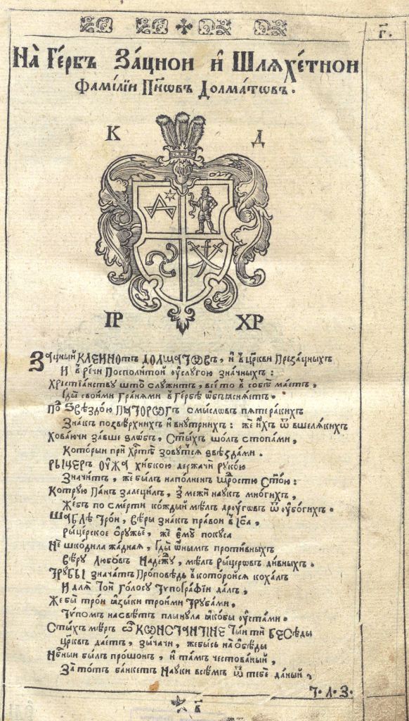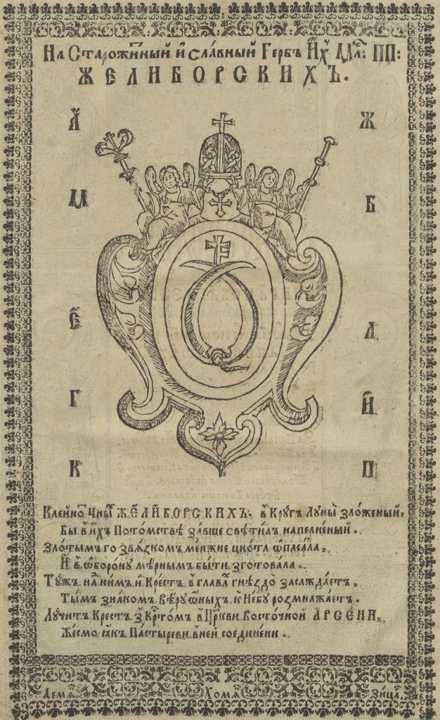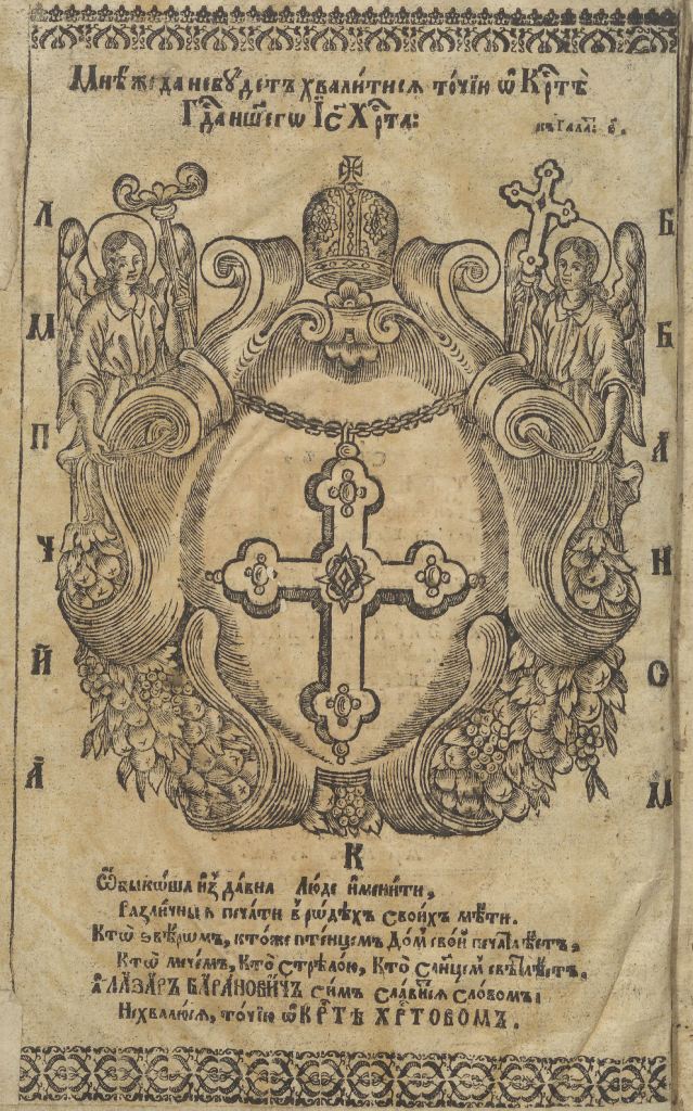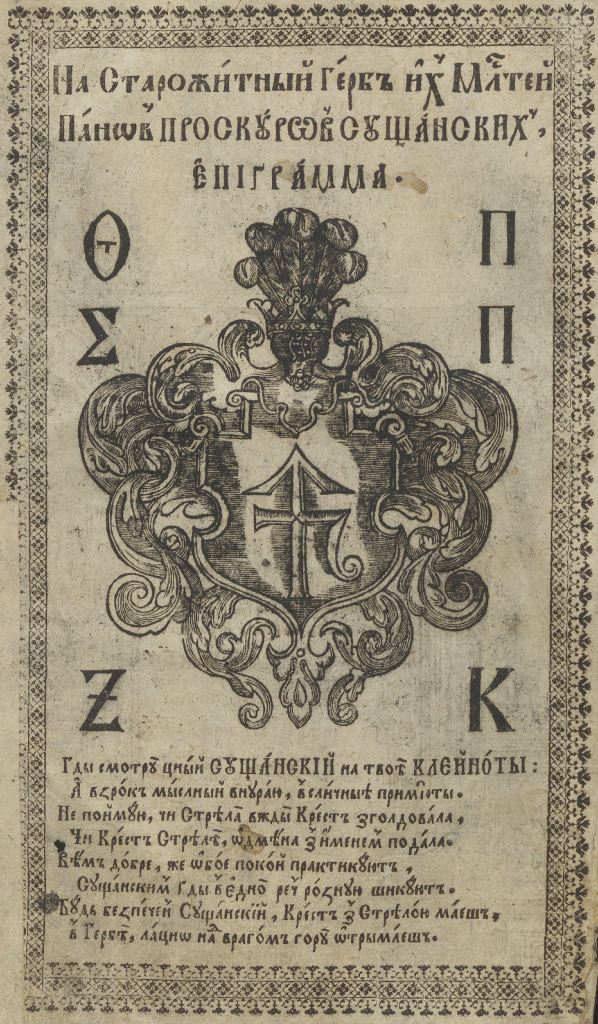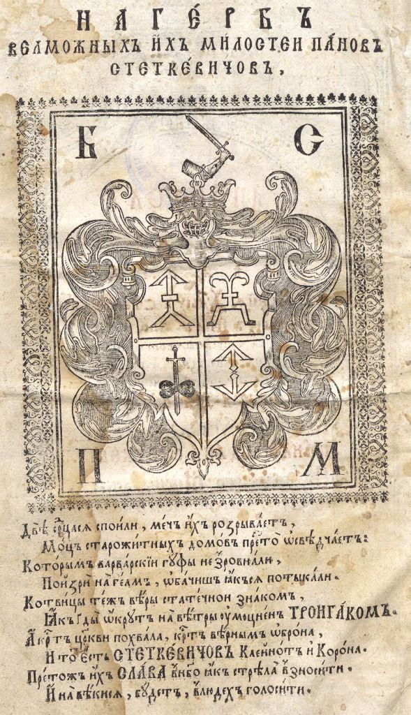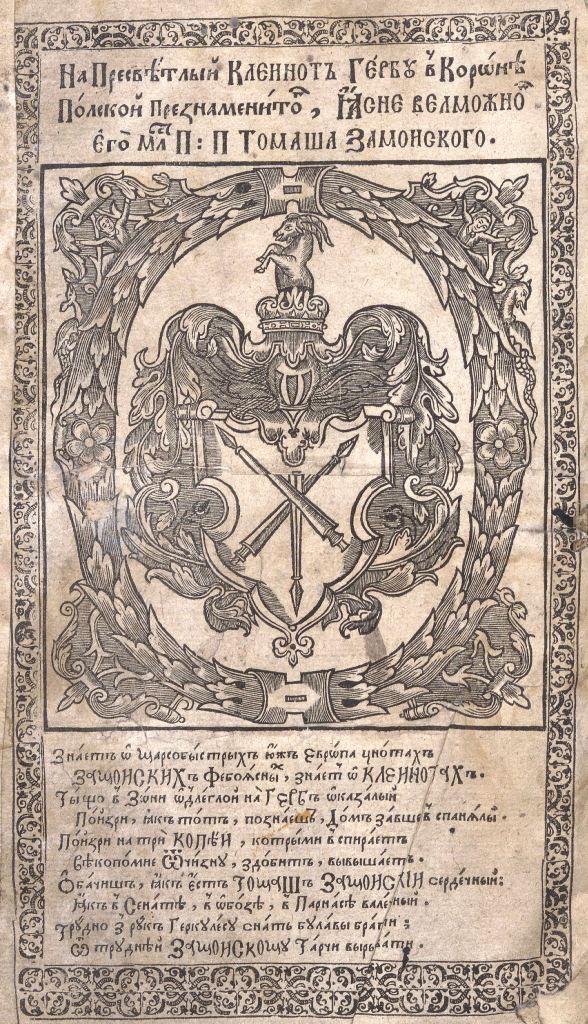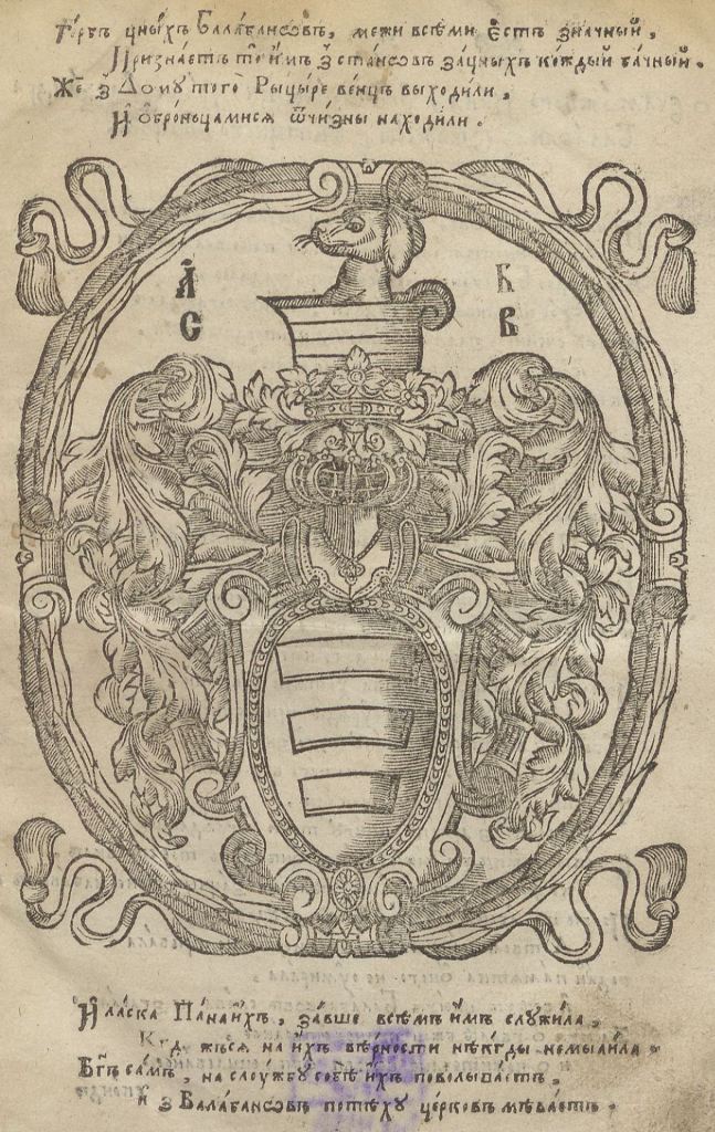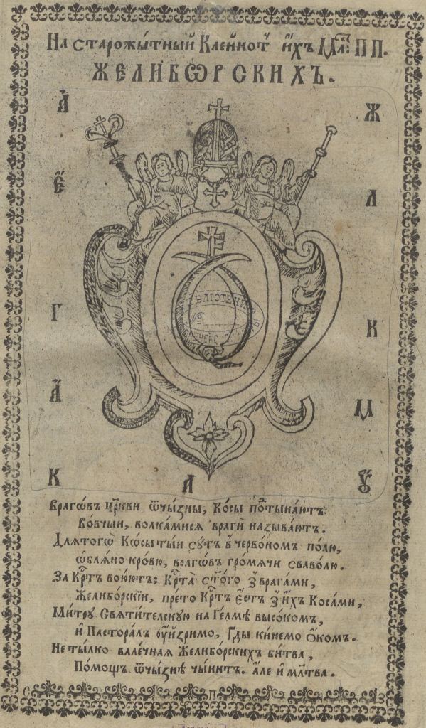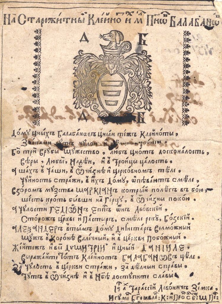 Геральдична поезія – жанр української літератури ранньомодерної доби, зародження та розвиток якого тісно пов’язаний з практикою книгодрукування. Відсутність централізованого фінансування видавничих підприємств, що діяли на теренах України в XVI–XVIII ст., спонукало друкарів до пошуку меценатської підтримки. Прикрашання книг зображеннями гербів заможних та впливових осіб стало дієвим способом подяки та заохочення виділяти кошти на потреби друкарень. Подяка меценатові висловлювалася у текстах присвят до видання, а шляхетність його походження підкреслювалася в текстах віршів до зображення родового герба. Хронологічно першим зразком україномовної геральдичної поезії, надрукованої на теренах України, став вірш на герб засновника острозької друкарні – Василя Костянтина Острозького, вміщений у виданні Біблії 1581 р. (іл. 1). Значний вплив Острозьких на розвиток книгодрукування сприяв тому, що вірші на герб цієї родини наприкінці XVI – в першому десятилітті XVII ст. прикрашали не лише видання Острозької друкарні (іл. 3), але й траплялися у литовських друках (іл. 2, 4). Входження українських, польських та литовських земель у межі єдиної держави, Речі Посполитої, сприяло формуванню тісних зв’язків між освітньо-культурними осередками Львова, Києва, Почаєва, Вільно, Єв’є, Кракова, Варшави та ін. Відтак до спадщини української літератури зараховуються не лише геральдичні вірші, надруковані у складі українських книг, але усі поетичні тексти, дотичні до української культури, незалежно місця друку першоджерела. Вкрай неоднорідною є й мова українських геральдичних віршів. Поряд із текстами староукраїнською літературною мовою, що прикрашали церковнослов’янські та староукраїнські друки, для виданих в Україні латиномовних та польськомовних видань писалися вірші латинською та польською мовами. До ранніх зразків української геральдичної поезії належать вірші на герб Сапігів, Огінських, Вишневецьких і Воловичів (іл. 5, 7–9). Довготривалу впливовість магнатської родини Сапігів на культурне життя засвідчує презентований в експозиції латиномовний вірш із почаївського видання 1748 р. (іл. 6). Розквіт української геральдичної поезії пов’язаний із діяльністю друкарні Києво-Печерської лаври. Протягом 1620–1640-их рр. у складі лаврських видань було опубліковано довершені за формою зразки геральдичної поезії, присвячені світським представникам шляхти та архімандритам святої обителі. Серед них вірші на герб родин Долматів (іл. 12–13), Балабанів (іл. 11), Стеткевичів (іл. 15), Замойських (іл.17), Святополків Четвертинських (іл. 18), Киселів (іл. 25), Проскурів Сущанських (іл. 27). Непересічну роль у розвитку української геральдичної поезії відігравала також друкарня Львівського Успенського братства. Одне з найошатніших видань братської друкарні початку XVII ст., видання «Книги о священстві» Іоанна Златоуста 1614 р., вшановує рід Балабанів (іл. 10). Бібліографічною рідкістю є на сьогодні вірші, що містилися на звороті титульного аркуша в різних варіантах примірників із тиражу Октоїха 1630 р. друкарні Львівського братства. В експозиції представлено вірш Мирону Бернавському (іл. 16), проте в тиражі цього видання були також вірші на герб Олександра Балабана, Катерини Боговитинової Ярмолинської та Мойсея Могили. Протягом XVII ст. велика кількість геральдичних віршів публікувалас