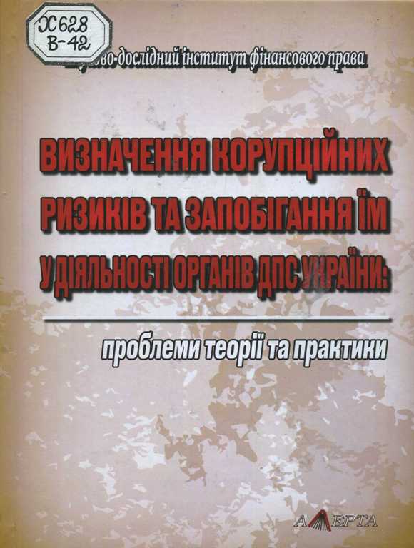 6. Визначення корупційних ризиків та запобігання їм у діяльності органів ДПС України: проблеми теорії та практики [Текст] : [монографія] / [В. В. Лисенко та ін.] ; Держ. податк. адмін. України [та ін.]. - К. : Алерта, 2010. - 222 с.