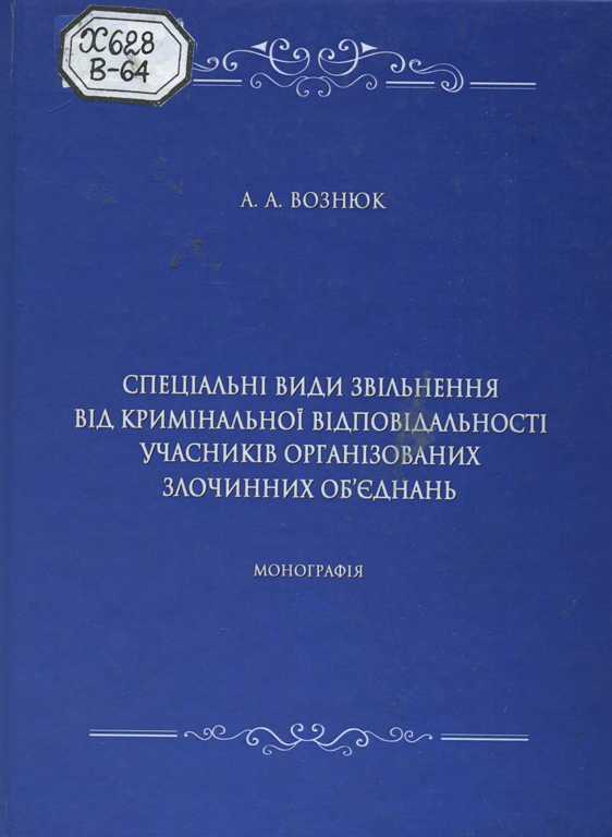 Спеціальні види звільнення від кримінальної відповідальності учасників організованих злочинних об'єднань [Текст] : монографія / Вознюк Андрій Андрійович ; Нац. акад. внутр. справ. - Київ : Нац. акад. внутр. справ, 2015. - 235 с.