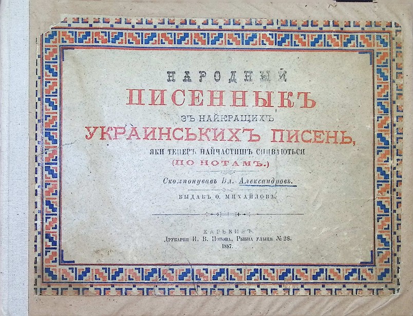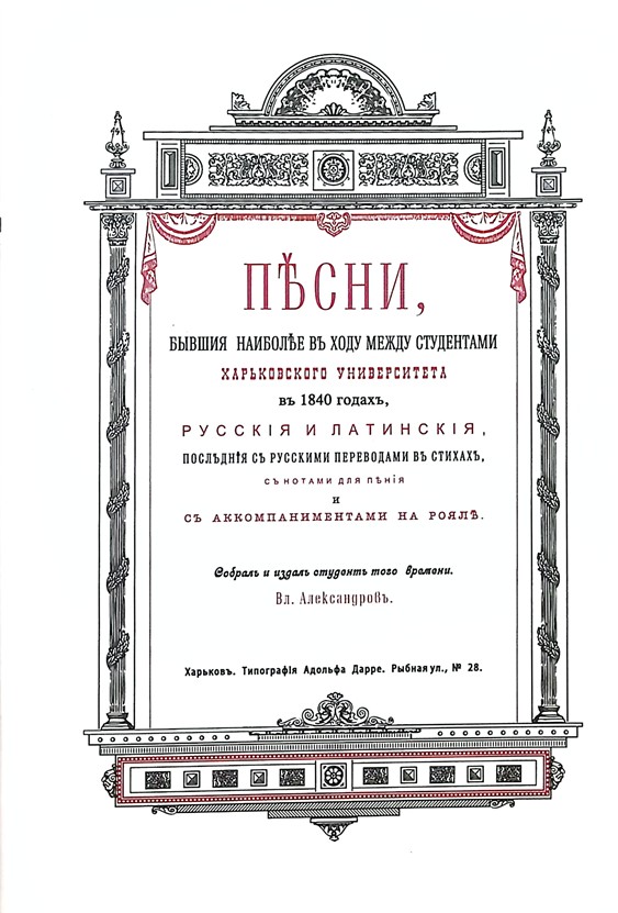 В. Александров зібрав і видав нотну збірку пісень студентів Харківського університету. Мабуть це перше видання студентського репертуару українського навчального закладу, надруковано у 1891 р. у типографії Адольфа Дарре. У відділі музичних фондів, зберігається видання «Песни, бывшия наиболее в ходу между студентами Харьковского университета в 1840 годах, русския и латинския, последния с русскими переводами в стихах : с нотами для пения и аккомп. на рояле / собрал и издал студент того времени Вл. Александров», це точна копія (факсиміле) першоджерела, перевидано в Харкові 2011 року (іл. 12).