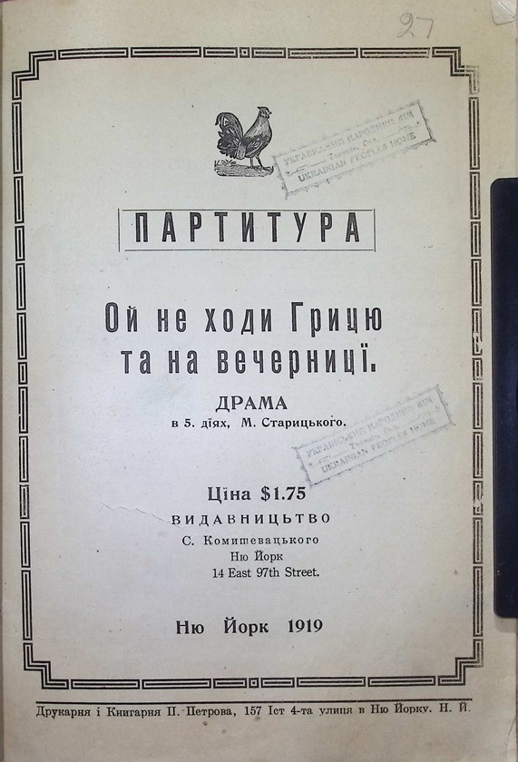 У відділі музичних фондів зберігаються дві оперети В. Александрова «За Немань іду» та «Ой не ходи Грицю та на вечорниці». Вочевидь, що твори надруковано вже за редакцією М. Старицького. Публікацію двох оперет здійснено у Нью-Йорку 1919 року, у видавництві С. Комишовацького, у друкарні П. Петрова. Слід звернути увагу, що на титульному аркуші оперети «За Немань іду» зазначено, що це твір В. Александрова (іл. 10), а на титульному аркуші оперети «Ой не ходи Грицю та на вечорниці» вказано, що це драма М. Старицького (іл. 11). Вочевидь, це помилка видавців, позаяк відомо, що М. Старицький вже після смерті В. Александрова вніс певні зміни до його оперет, трансформувавши їх у драму.