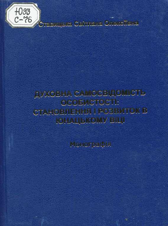 Духовна самосвідомість особистості: становлення і розвиток в юнацькому віці [Текст] : монографія / Ставицька Світлана Олексіївна ; Нац. пед. ун-т ім. М. П. Драгоманова, Ін-т соціол., психології та упр, Каф. теорет. та консульт. психології. - К. : НПУ ім. М. П. Драгоманова, 2011. - 728 с.