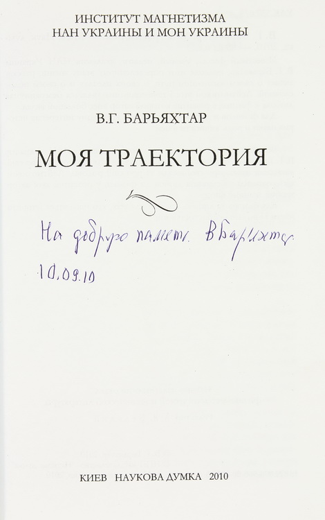 В експозиції представлено спогади В. Г. Бар’яхтара «Моя траєкторія» (2010) та деклараційний патент на вихід «Датчик струму з магніторезистивною плівкою» (2004), співавтором якого був вчений.