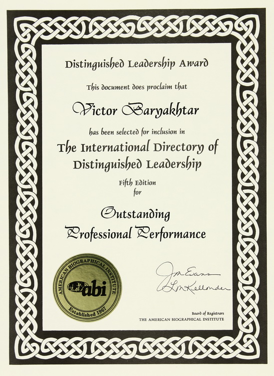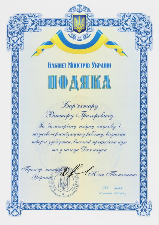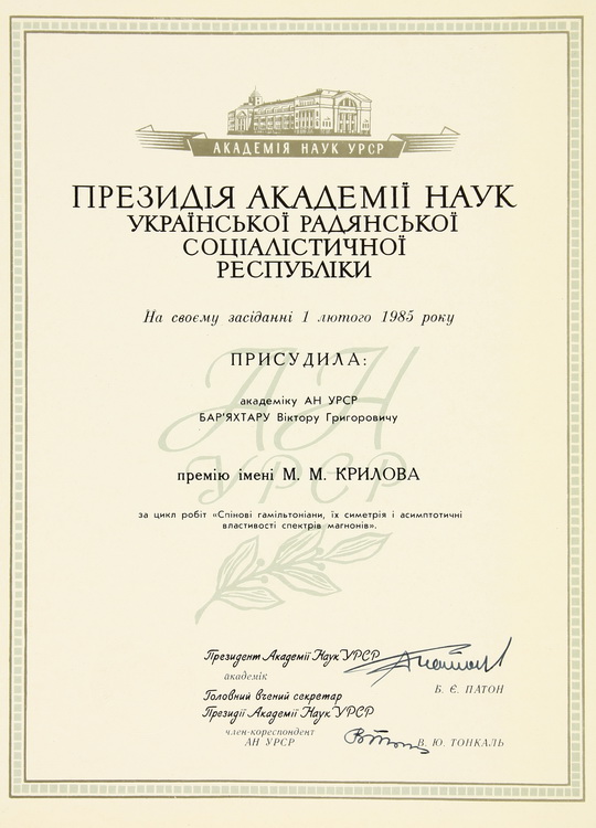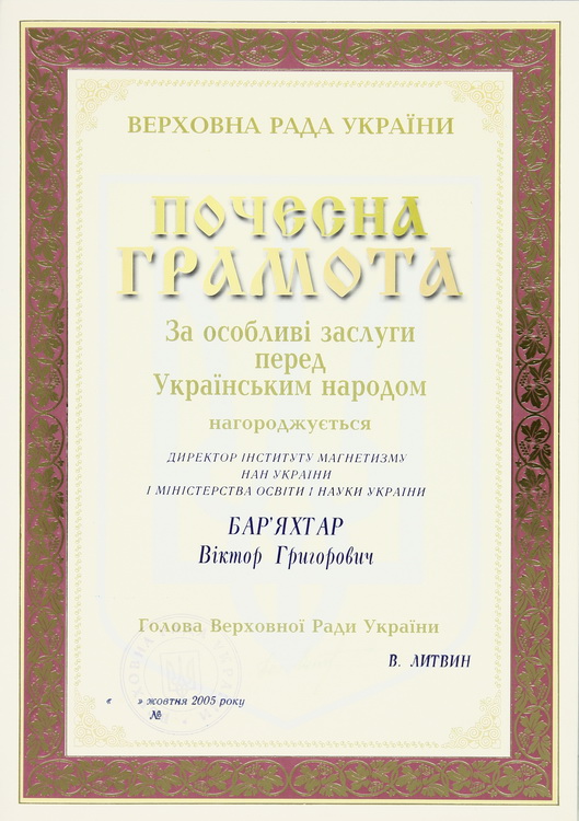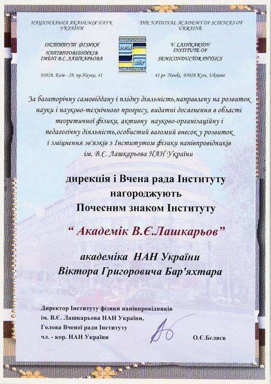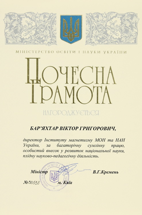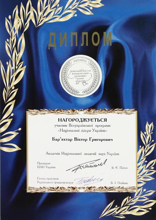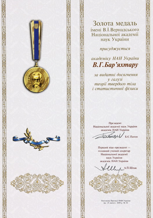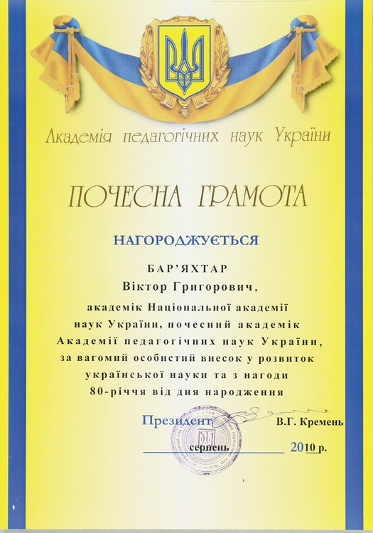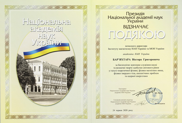 Віктор Григорович Бар’яхтар ‑ видатний вчений у галузі теоретичної фізики магнітних явищ, фізики твердого тіла, надпровідності, механіки твердих тіл, кінетики солітонів, автор теорії спектрів магнітопружних хвиль, доктор фізико-математичних наук (1965), академік НАН України (1978), заслужений діяч науки і техніки УРСР (1980), Герой України (2010).