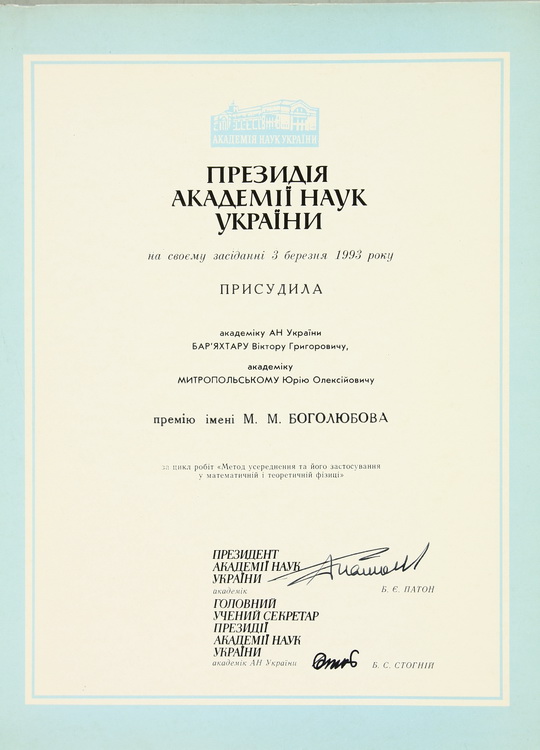 Документи біографічного характеру репрезентують дипломи про присвоєння премій НАН України: імені М. М. Крилова (1985); імені М. М. Боголюбова (1993), імені С. І. Пекаря (2005), свідоцтво лауреата Золотої медалі імені В. І. Вернадського НАН України (2009).
