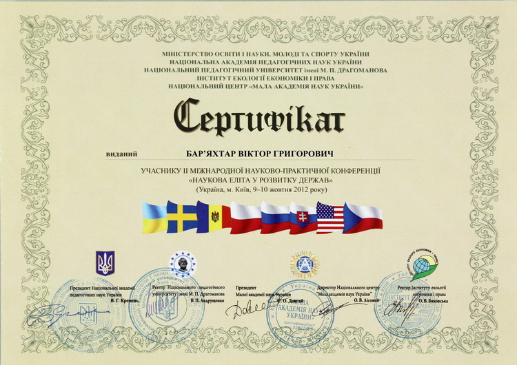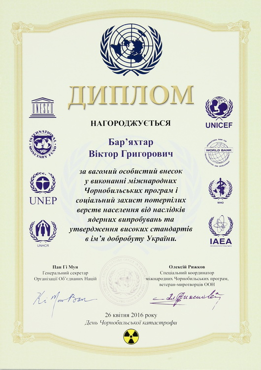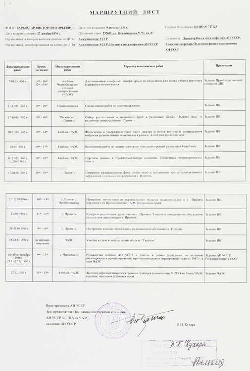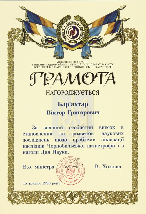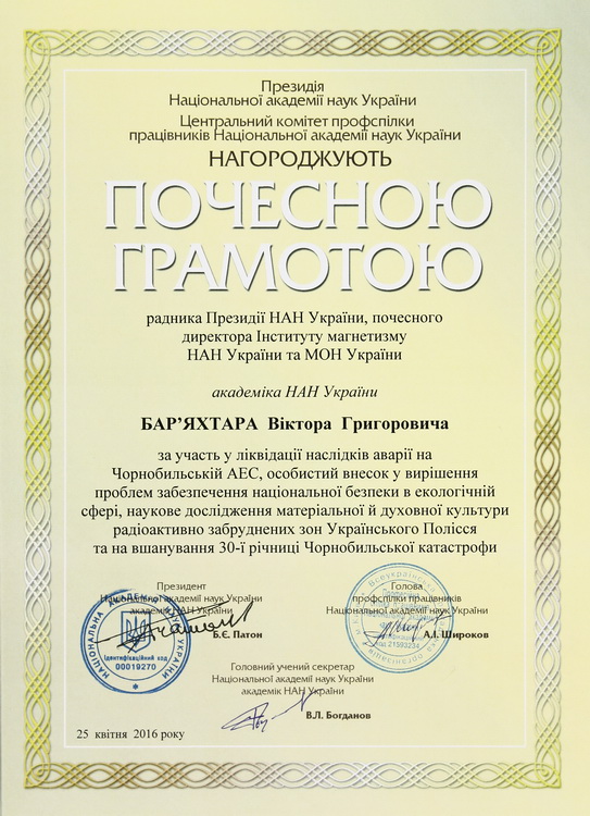 Завершує експозицію документи з діяльності, серед яких: маршрутний лист щодо місць виконання робіт (4-й блок Чорнобильської атомної електростанції, м. Прип’ять) (1986); списки осіб, що захистили кандидатські та докторські дисертації під керівництвом В. Г. Бар’яхтара [1990-ті рр.]; сертифікат учасника ІІ Міжнародної науково-практичної конференції «Наукова еліта у розвитку держав» (2012).