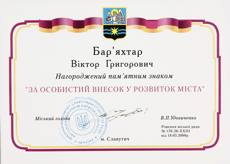 Експонується сертифікат «Alliance consortium LTD» (1995), посвідчення про нагородження пам’ятним знаком «За особистий внесок у розвиток міста» (м. Славутич, 2000).