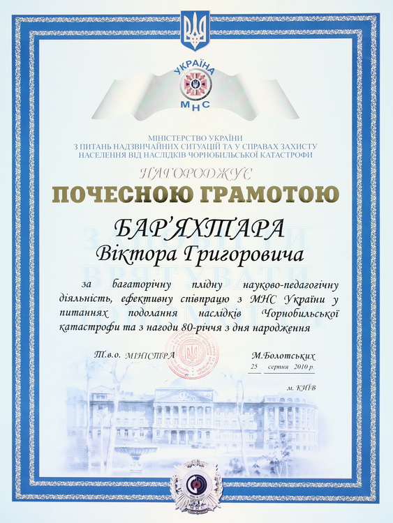 Із нагород вченого на виставці представлено: грамоти Міністерства України з питань надзвичайних ситуацій та у справах захисту населення від наслідків Чорнобильської катастрофи з нагоди Дня науки, 80-річчя НАН України (1998), Міністерства України з питань надзвичайних ситуацій та у справах захисту населення від наслідків Чорнобильської катастрофи (2010); почесні грамоти Верховної Ради України (2005), Академії педагогічних наук України (2010), Президії НАН України (2016), Міністерства освіти та науки України (б/д); подяка Кабінету Міністрів України з нагоди Дня науки (2008).