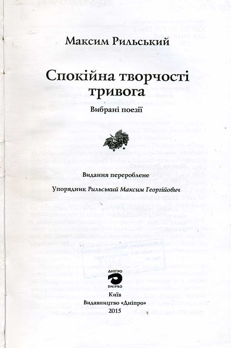 18. Спокійна творчості тривога : вибр. поезії / М. Т. Рильський ; упоряд. М. Г. Рильський. – Вид. перероб. – Київ : Дніпро, 2015. – 510 с. : фот.