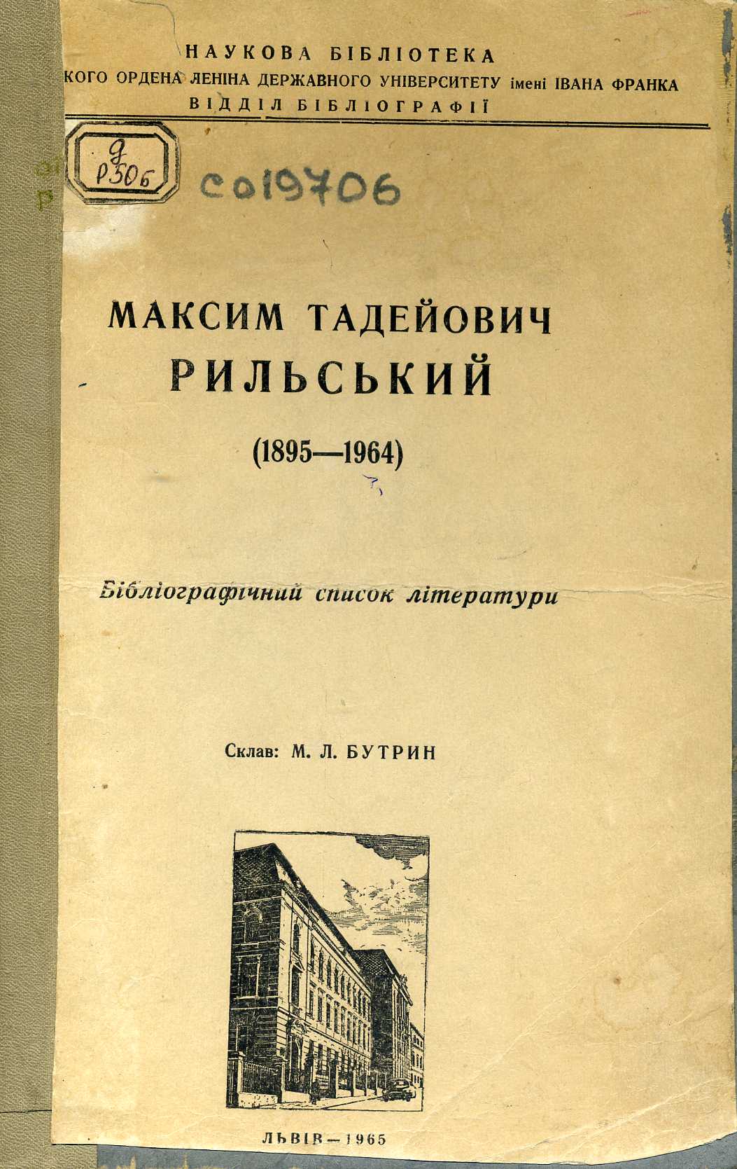 320. Максим Тадейович Рильський (1895–1964) : бібліогр. сп. літ. / Наук. б-ка Львів. держ. ун-ту ім. І. Франка, Від. бібліографії ; склав М. Л. Бутрин ; відп. ред. Ф. П. Максименко. – Львів, 1965. – 31 с.