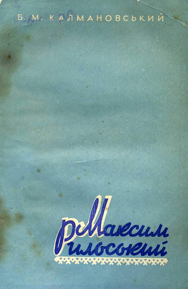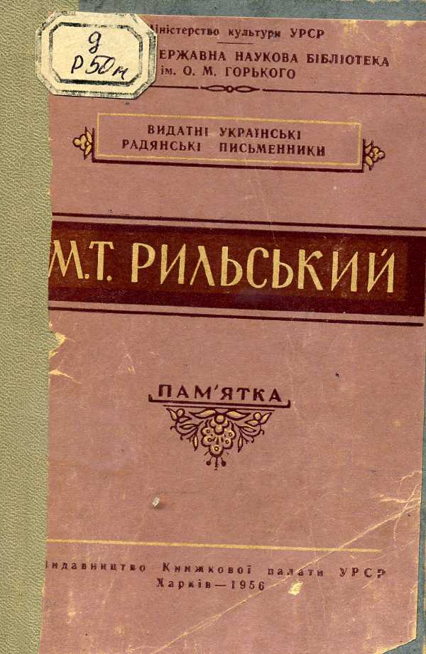 318. М. Т. Рильський : пам’ятка / Одес. держ. наук. б-ка ім. О. М. Горького ; склала В. Ф. Місюра ; наук. ред. І. М. Дузь. – Харків : Вид-во Кн. палати УРСР, 1956. – 25 с. – (Видатні українські радянські письменники ; Вип. 1).