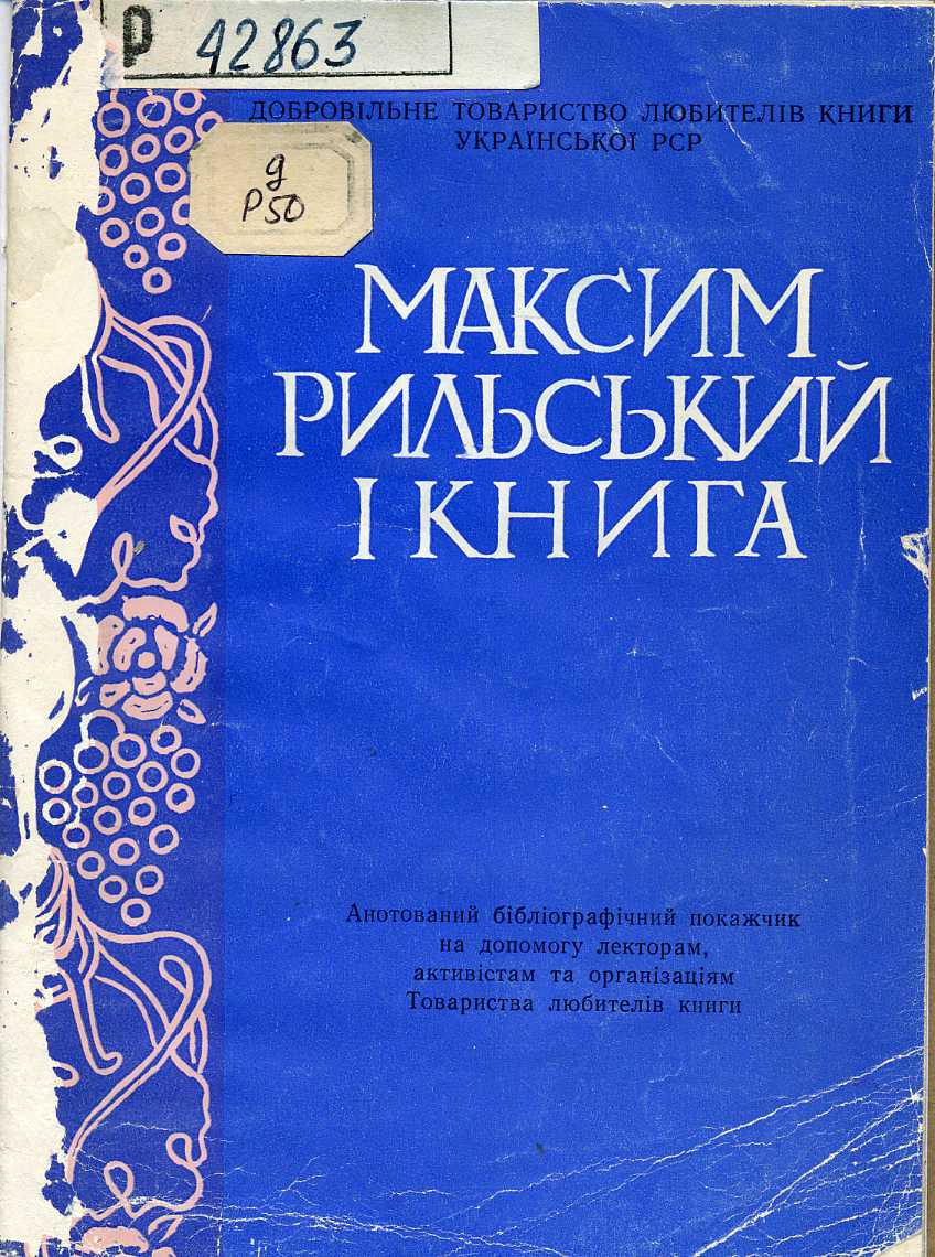 330. Максим Рильський і книга : анот. бібліогр. покажч. / Добровільне тов-во любителів книги Укр. РСР ; уклад. І. О. Ільєнко ; наук. ред. В. В. Яременко. – Київ, 1984. – 40 с. – (На допомогу лекторам, активістам та організаціям Товариства любителів книги).