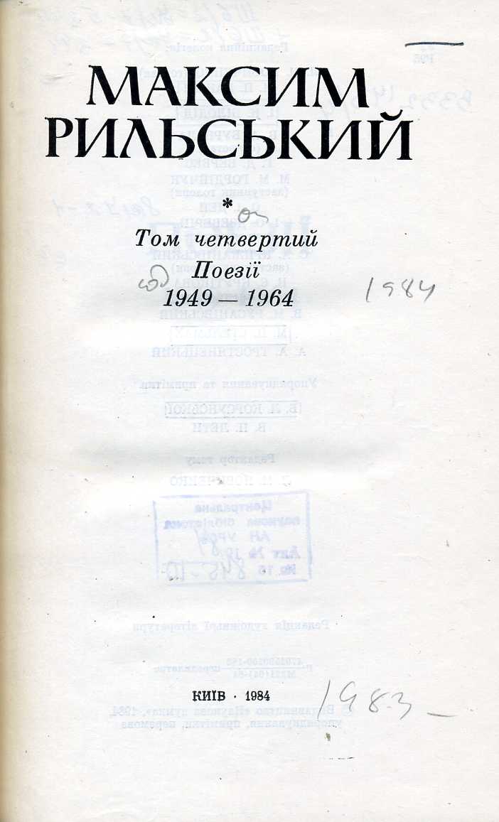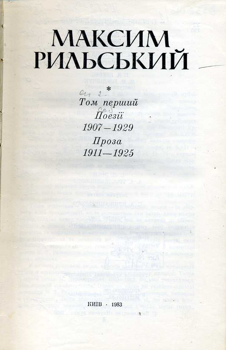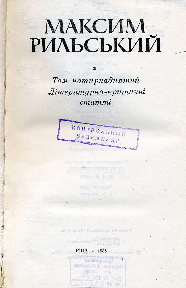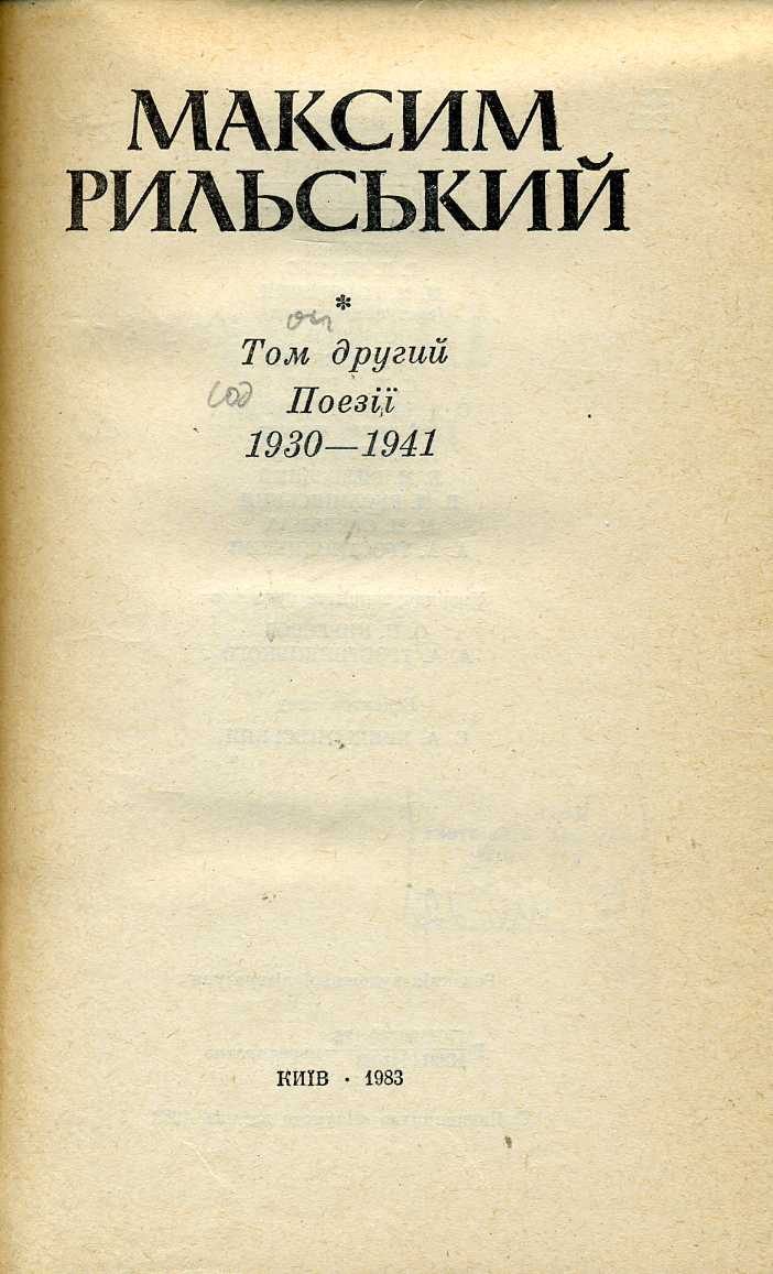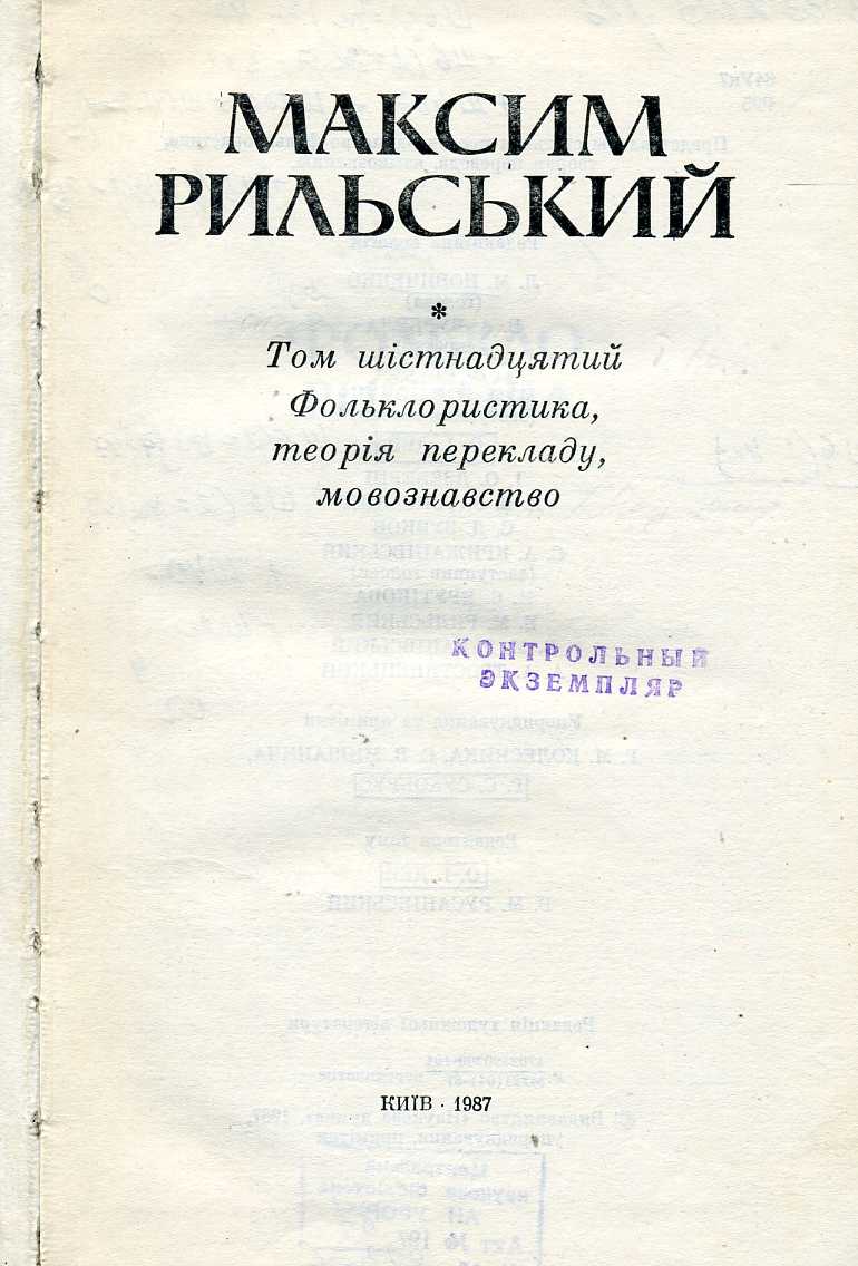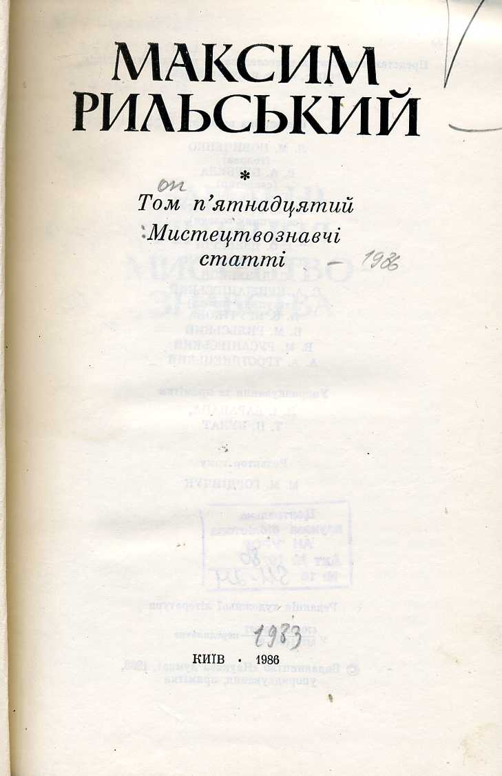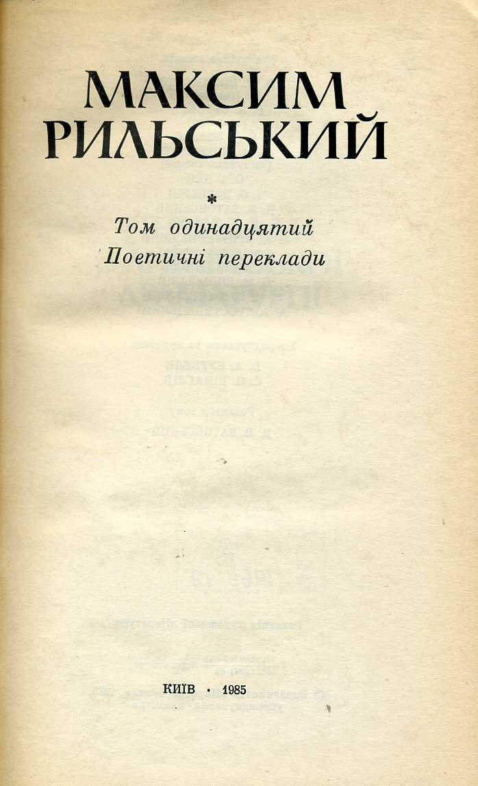 1. Зібрання творів : у 20 т. / М. Т. Рильський ; АН УРСР, Ін-т літ. ім. Т. Г. Шевченка ; редкол. : Л. М. Новиченко (голова) [та ін.]. – Київ : Наук. думка, 1983–1990.