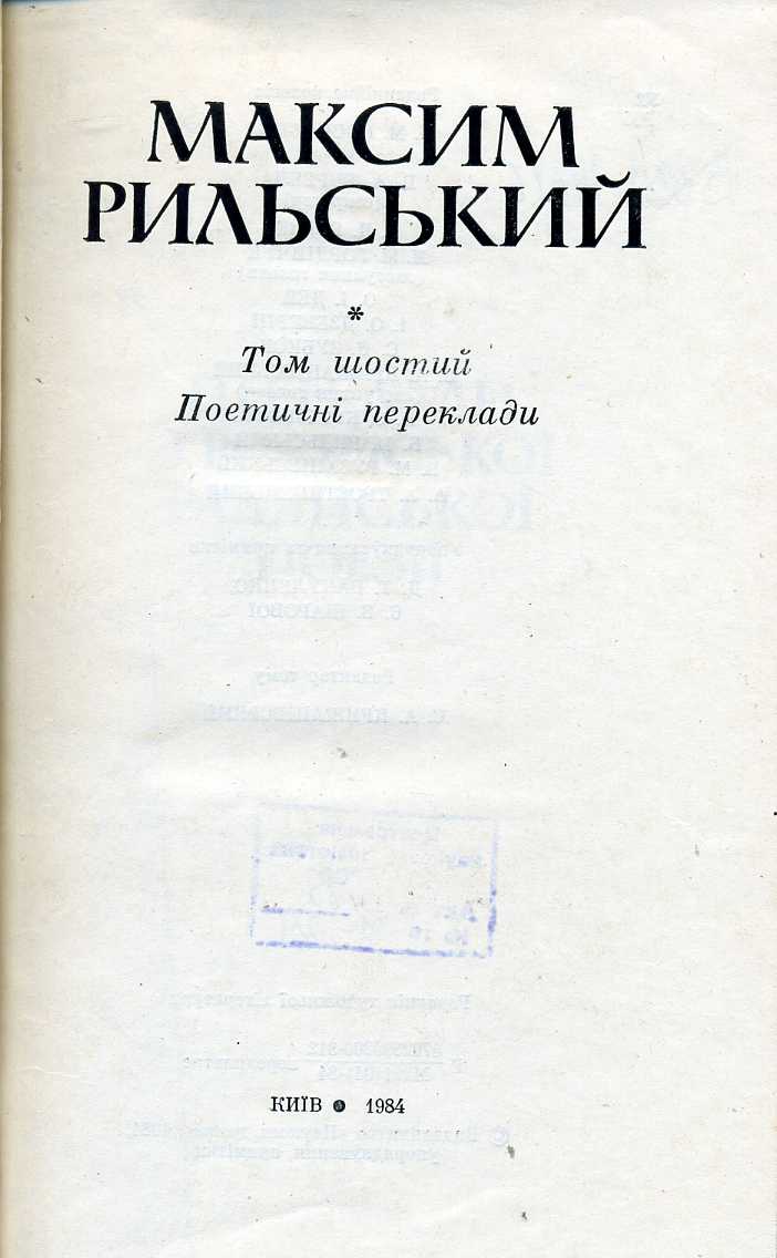 Т. 6 : Поетичні переклади / упоряд. та прим. Д. Т. Вакуленко, Є. В. Шарова ; ред. тому С. А. Крижанівський. – 1984. – 439 с. : портр., іл.