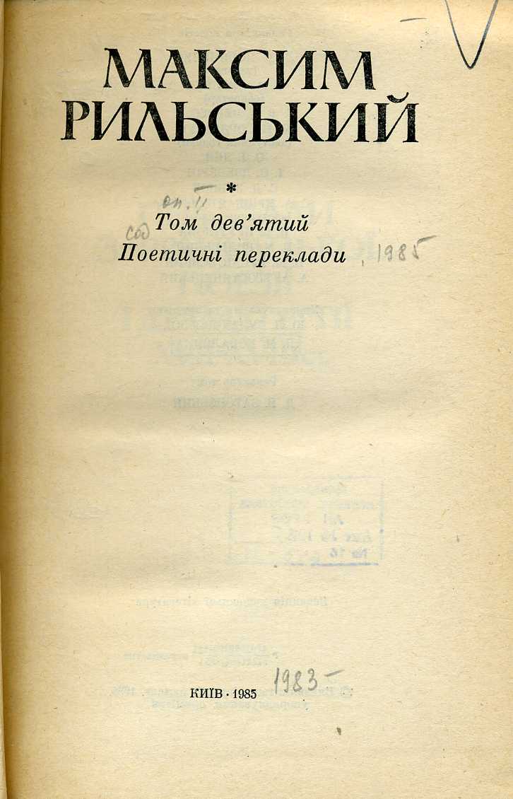 Т. 9 : Поетичні переклади / упоряд. та прим. Ю. Л. Булаховська, Л. М. Коваленко ; ред. тому Д. В. Затонський. – 1985. – 496 с. : портр., 2 л. іл.