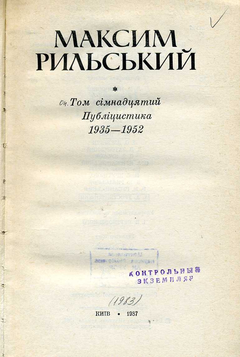 Т. 17 : Публіцистика 1935–1952 / упоряд. та прим. І. П. Березовського ; ред. тому С. Д. Зубков. – 1987. – 510 с. : портр., 2 л. іл.