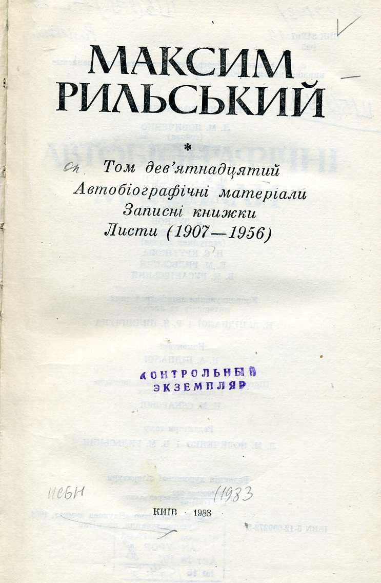 Т. 19 : Автобіографічні матеріали. Записні книжки. Листи (1907–1956) / упоряд. автобіогр. матеріалів та листів: Н. А. Підпала, Р. Я. Пилипчук ; ред. тому: Л. М. Новиченко, Б. М. Рильський. – 1988. – 704 с. : портр., 2 л. іл.