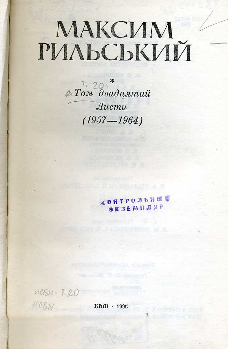 Т. 20 : Листи (1957–1964) / упоряд.: Н. А. Підпала, Р. Я. Пилипчук ; ред. тому: Л. М. Новиченко, Б. М. Рильський. – 1990. – 896 с. : портр., 2 л. іл.