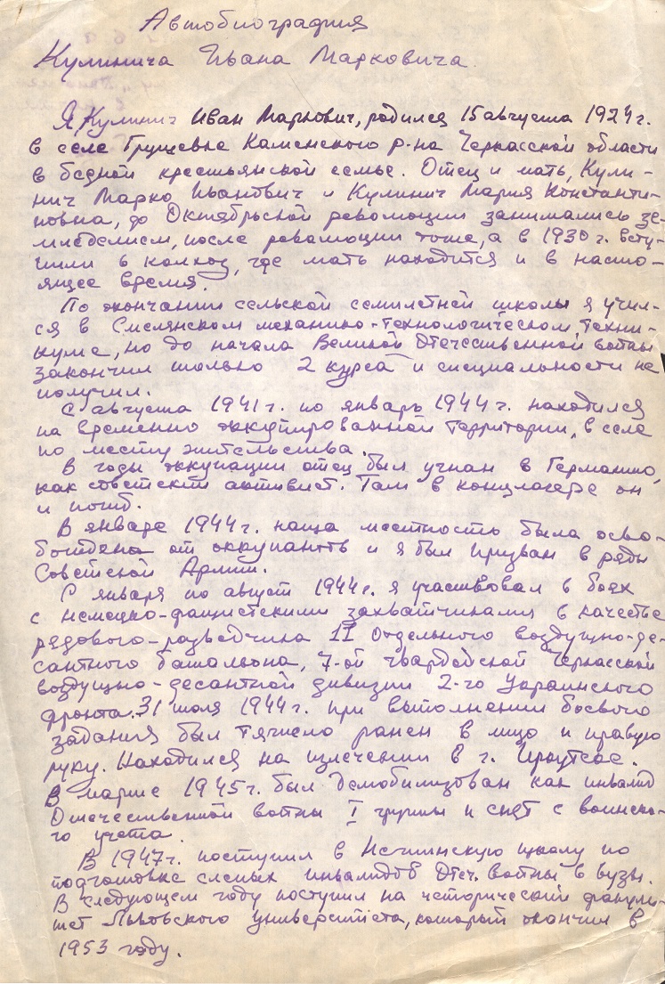 Народився Іван Маркович 15 серпня 1924 року в селі Грушківка Кам’янського р-ну (нині – Черкаський р-н) Черкаської обл. в селянській родині. Після закінчення місцевої семирічної школи навчався у Смілянському механіко-технологічному технікумі цукрової промисловості. У роки німецько-радянської війни був мобілізований до Червоної армії, служив у складі гвардійської Черкаської повітряно-десантної дивізії ІІ Українського фронту, брав участь у Корсунь-Шевченківській битві та Яссько-Кишинівській операції, де зазнав тяжкого поранення, внаслідок якого втратив зір. Попри інвалідність, продовжив навчання: після закінчення Ніжинської школи для сліпих інвалідів війни у 1948 році вступив на історичний факультет Львівського університету, який закінчив із відзнакою у 1953 році.