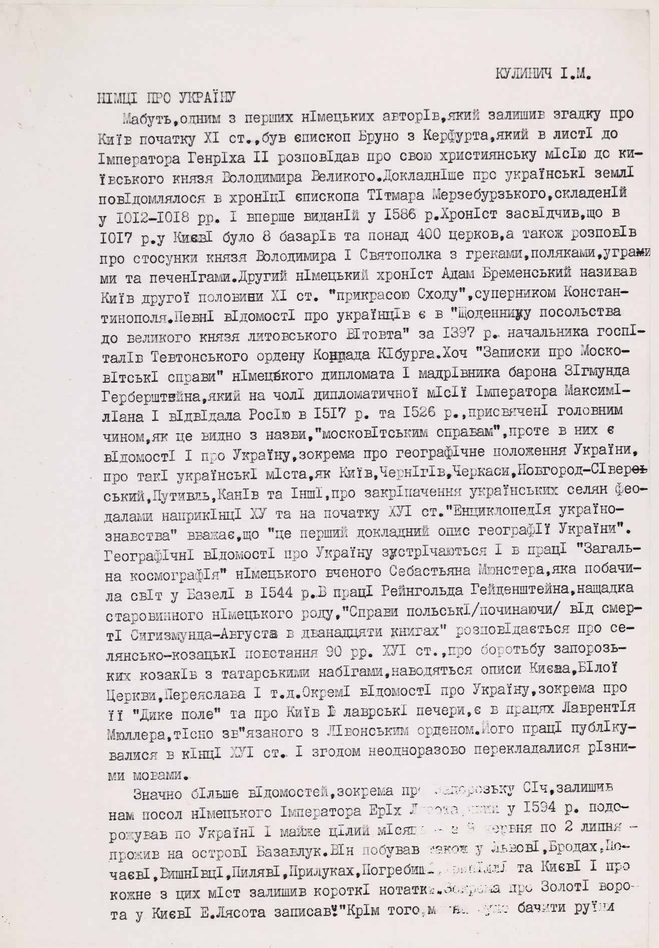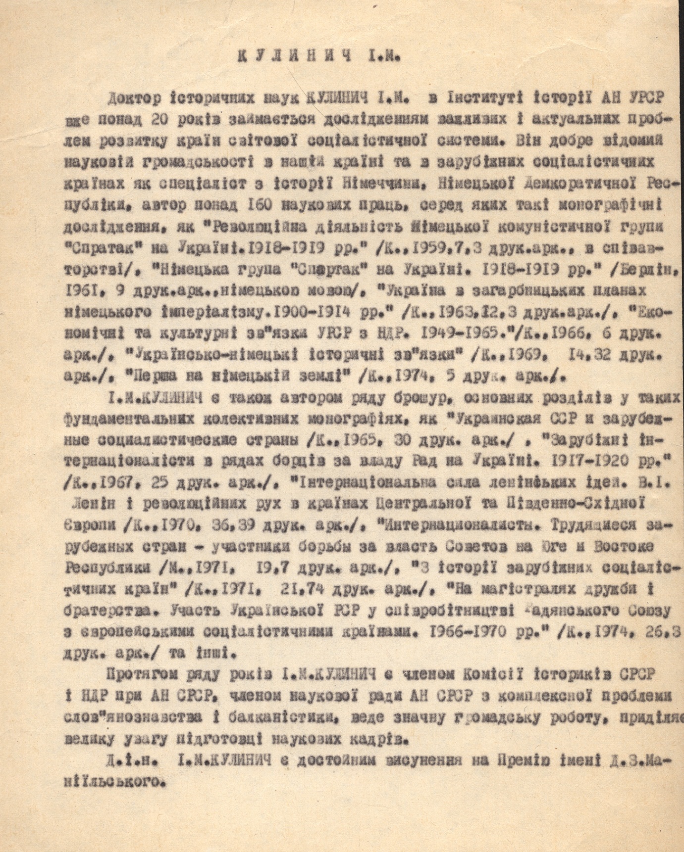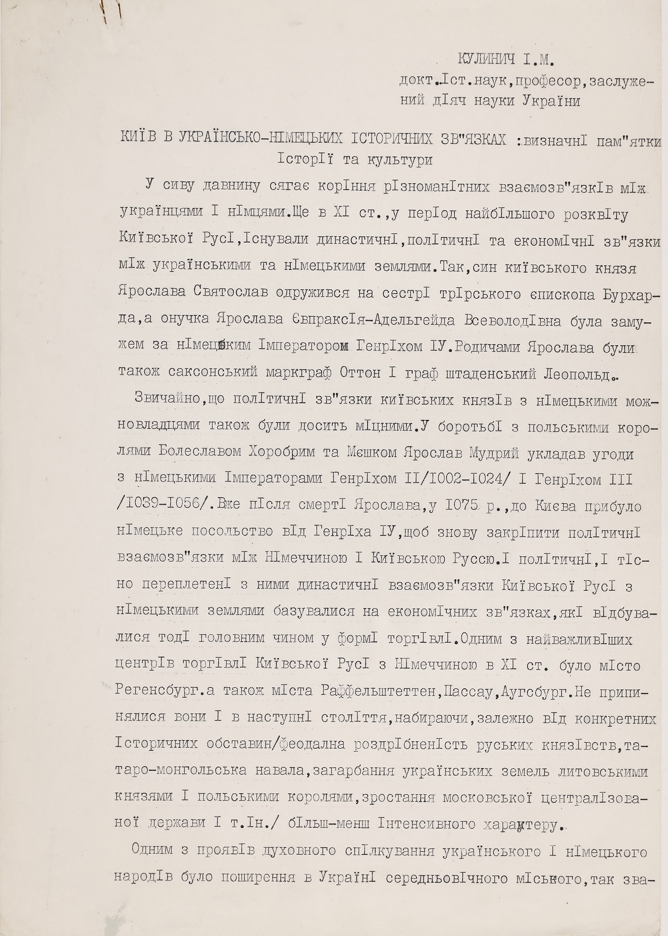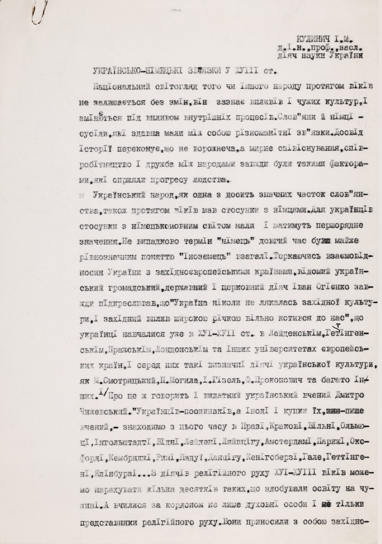 15 серпня 2024 року українська наукова громада відзначила поважну дату – 100-річчя від дня народження Івана Марковича Кулинича, видатного германіста, доктора історичних наук, професора Інституту історії НАН України. Роль Івана Марковича у формуванні української історичної германістики важко переоцінити. Його наукові студії, педагогічна діяльність, активна громадська робота, а також внесок в просування української гуманітарної науки надають йому заслуженого статусу одного з провідних діячів української історичної науки свого часу. Відомий своїми історико-культурними дослідженнями Німеччини, українсько-німецьких зав’язків, німецької громади України, Іван Кулинич започаткував чимало наукових напрямів у цій сфері, створив школу молодих учених та сприяв наведенню містків між українською та західноюєвропейською науками.