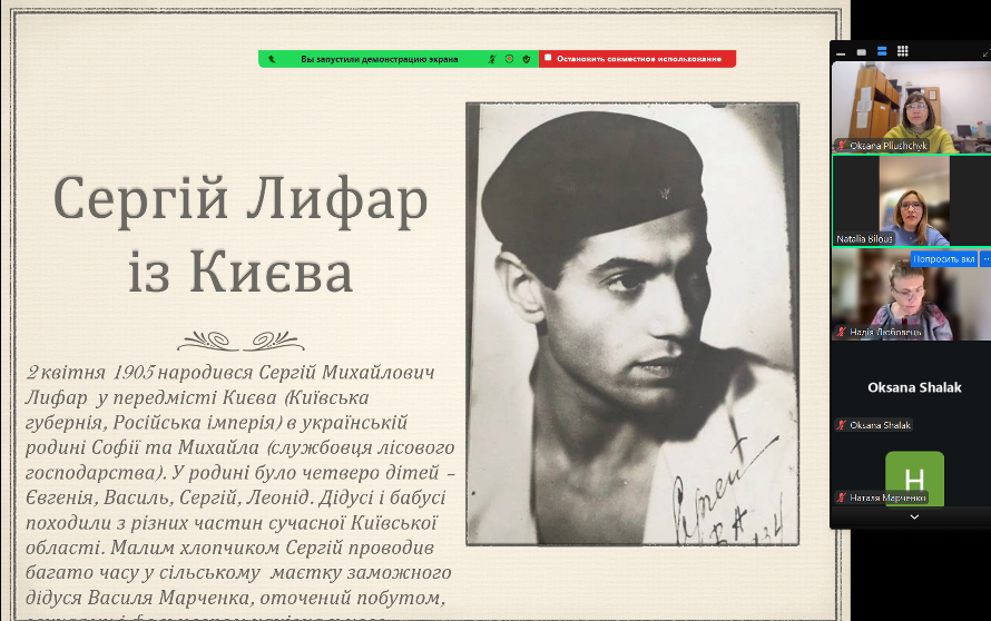 Виступ Наталі Білоус, завідувачки філією «Музей Сержа Лифаря» Музею історії міста Києва, на тему «З маловідомих фактів біографії Сержа Лифаря: подорож до Аргентини 1934 року» супроводжувався цікавим матеріалом із захопливим поданням науковиці й презентацією архівних документів: листівками з подорожі митця, листами, анонсами виступів тощо, цінними для реконструкції його біографії.