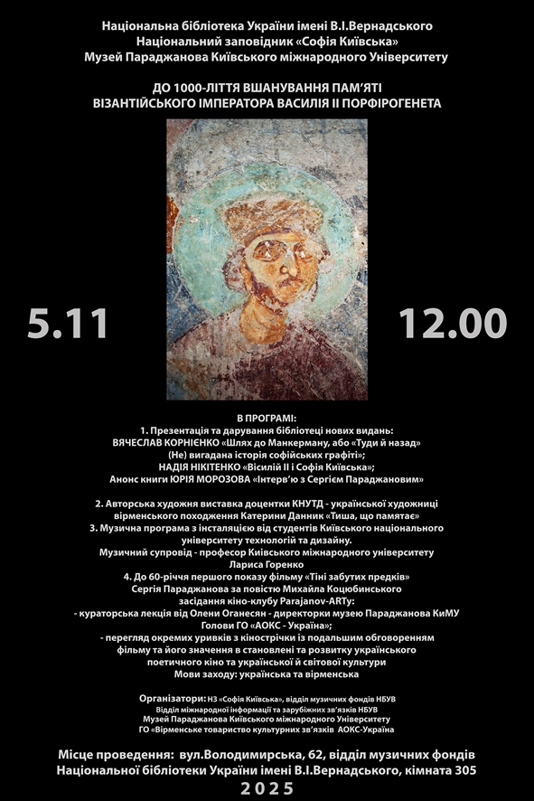 5 листопада 2025 року Національна бібліотека України імені В. І. Вернадського запрошує на урочистий культурно-науковий захід, присвячений 1000-літтю вшанування пам’яті Візантійського імператора Василія ІІ Порфірогенета – постаті, що стоїть на перехресті європейської, української та вірменської історій.Подію організовано спільно з Національним заповідником “Софія Київська” та Музеєм Параджанова Київського міжнародного університету.