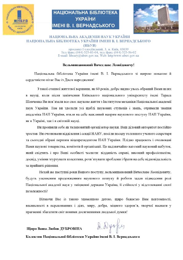 Національна бібліотека України імені В. І. Вернадського щиро вітає з ювілеєм першого віцепрезидента Національної академії наук України Вячеслава Леонідовича Богданова