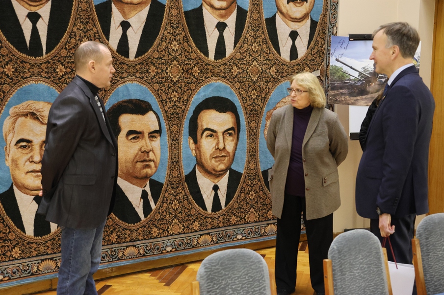 З цікавістю оглянув Андрейс Пілдеговічс хол Бібліотеки і «візитівку» НБУВ – велике монументально-декоративне панно «Біль землі» авторства художників В. Пасивенка та В. Прядка. Відзначив він також архітектурну унікальність пандусу й художню досконалість та просвітницьке значення гобелену-триптиху «Витоки слов’янської писемності», витканого майстрами М. Литовченко та І. Литовченком у техніці ручного ткацтва спеціально для корпусу НБУВ на Голосіївському проспекті. Як відомо, бібліотека імені В.І. Вернадського має найбільшу колекцію фондів зі славістики у світі.