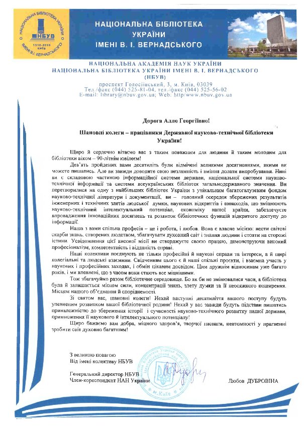 Державна науково-технічна бібліотека України відзначила цьогоріч своє 90-ліття. Національна бібліотека України імені В.І. Вернадського щиро привітала колег з цим ювілеєм і досягненнями упродовж багаторічного трудового шляху.