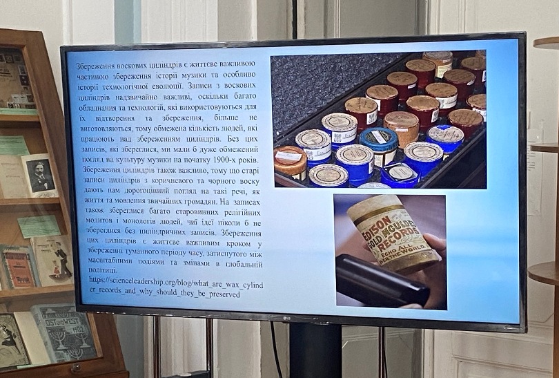 З доповіддю «Скарби єврейської культури в Україні», присвяченою багаторічній співпраці Національної бібліотеки України імені В.І. Вернадського та Інституту проблем реєстрації інформації (ІПРІ) з питань розробки й відновлення єврейської музичної спадщини, виступив Андрій Андрійович Крючин, заступник директора з наукової роботи Інституту проблем реєстрації інформації НАН України (ІПРІ), доктор технічних наук, професор, член-кореспондент НАН України. Доповідь він супроводжував відеопрезентацією з представленням самих процесів відновлення унікальних записів. А.А. Крючин подарував дипломатам диски іззаписами традиційної єврейської музики та фольклору, які були оцифровані з воскових валиківза унікальними технологіями, розробленими ІПРІ НАНУ. Ці колекції воскових валиківнині занесені до реєстру світової культурної спадщини ЮНЕСКО «Пам‘ять світу».