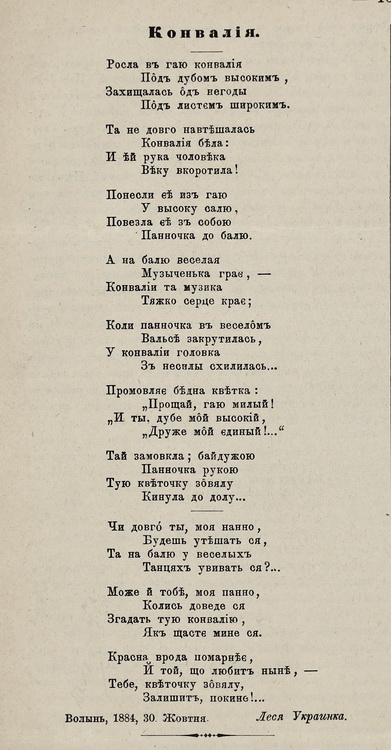 Уперше друкований вірш тринадцятирічної Лариси Косач «Конвалія» було опубліковано в № 22 (с. 186) часопису за 1884 р. під псевдонімом Леся Українка, який вона запозичила у свого дядька Михайла Драгоманова (той підписувався як «Українець»). Вірш було написано у мальовничому поліському селі Колодяжному, де поетеса провела свої дитячі та юнацькі роки.