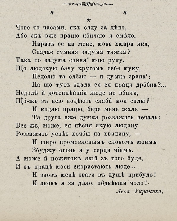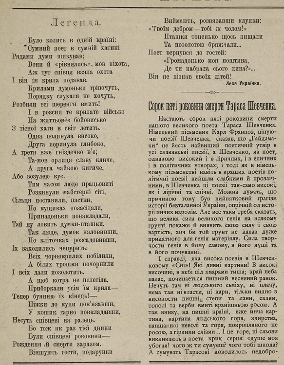 Крім того, цього ж року з’явилася низка її поезій: «Завітання» (№ 2, с. 25), «До природи» (№ 8, с. 133 — зразок пейзажної лірики), «Напровесні» (№ 9, с. 150 — вірш-маніфест ранньої інтимно-пейзажної лірики, що увійшов до збірки «На крилах пісень»), «Співець» (№ 21, с. 350–351), «В’язень» (№ 23, с. 335 — зразок громадянської лірики) та «Святий вечір!» (№ 24, с. 286–287).