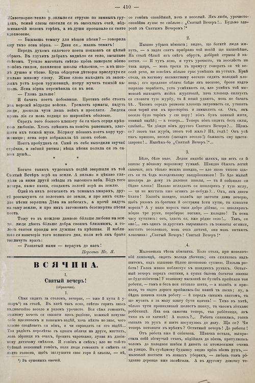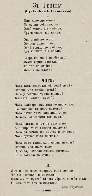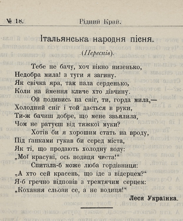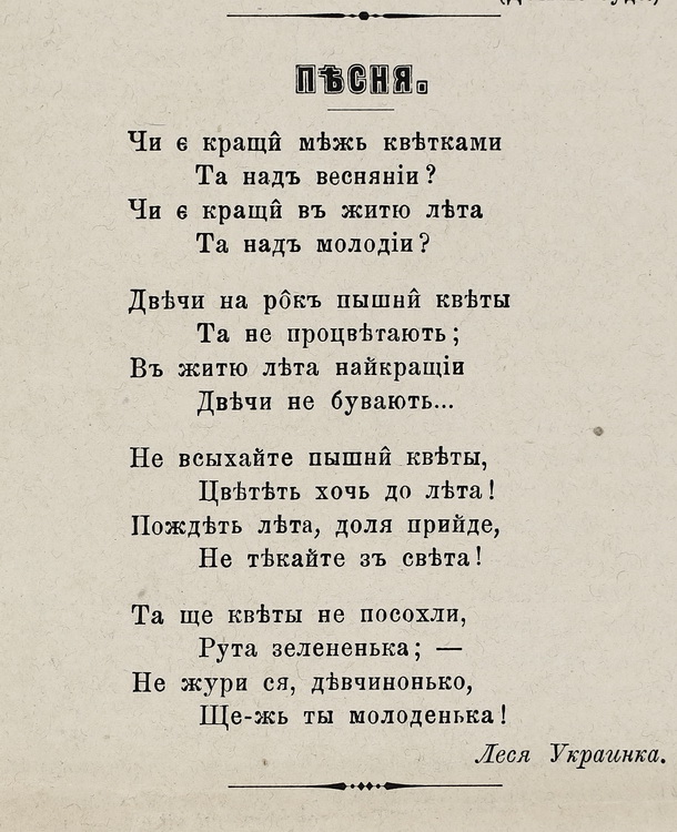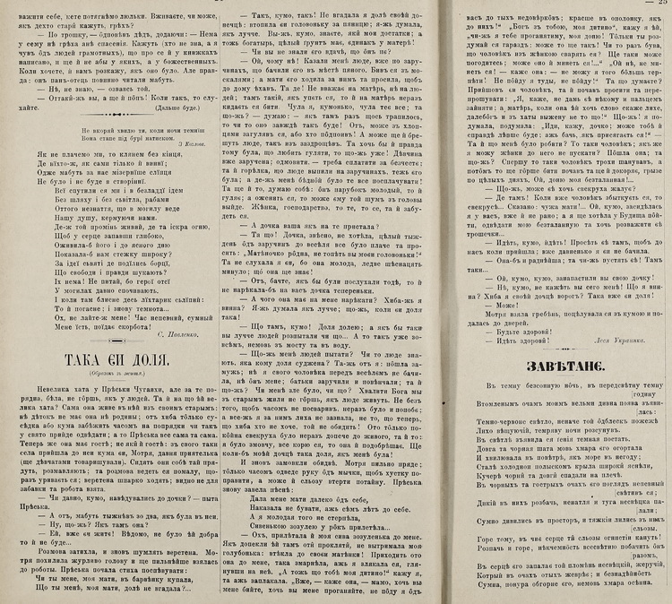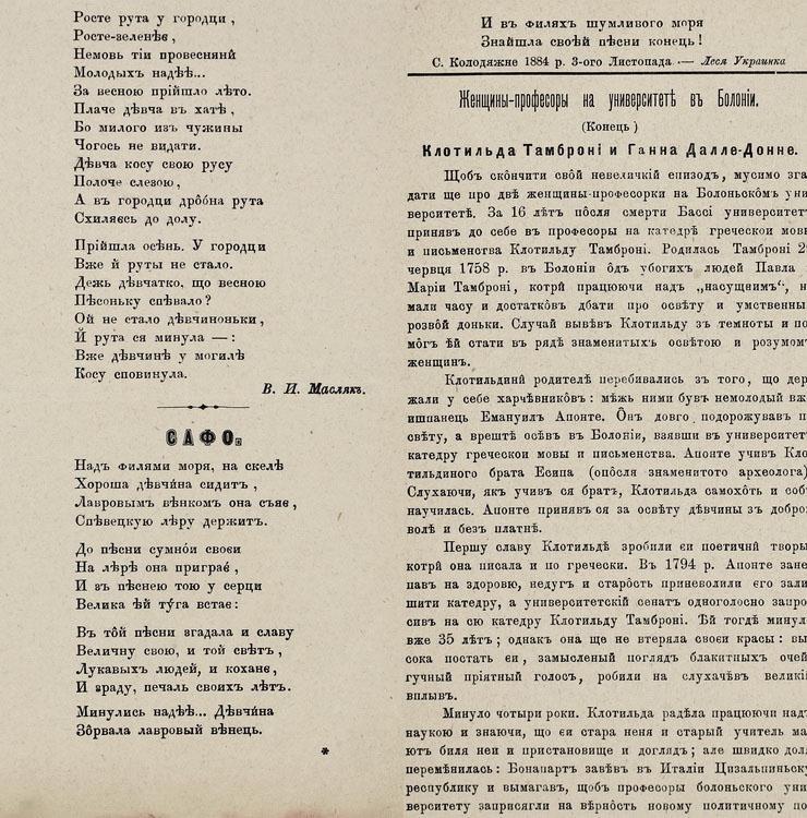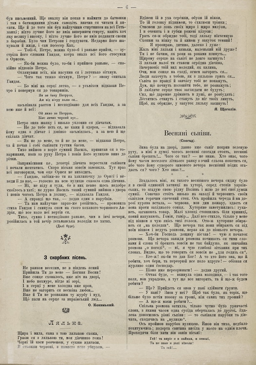 1889 р. став роком активної перекладацької діяльності поетеси. У журналі було надруковано її переклади творів німецького поета Генріха Гейне: «Вони мене дражнили…», «Чого так поблідли ті рожі ясні?», «Як я про свою говорив вам печаль» (№ 1, с. 5). У № 2 (с. 24–25) було опубліковано перший прозовий твір Лесі Українки — «Така її доля» (перше реалістичне оповідання про трагічну долю жінки).