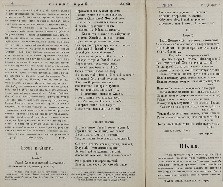 У щотижневому громадському і літературно-науковому журналі «Рідний край», що виходив у Полтаві у 1905–1907 рр., було надруковано переклади Лесі Українки з Віктора Гюго, Джорджа Байрона та Ади Негрі, а також її власні твори: «Пророк», драматичну поему «В катакомбах», цикл поезій «Весна в Єгипті», написаний під час лікування письменниці в цій країні.