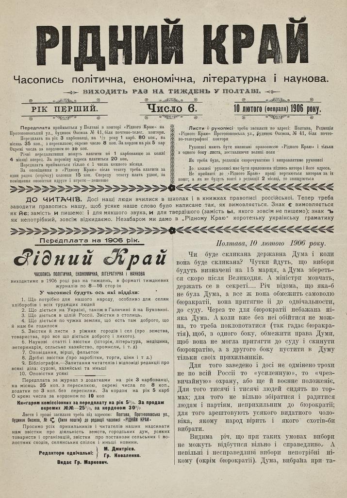 - Рідний край. Редактори одвічальні М. Дмитрієв, Гр. Коваленко. З 1907 р. – Олена Косач (Пчілка). – Полтава-Гадяч, 1905–1918.