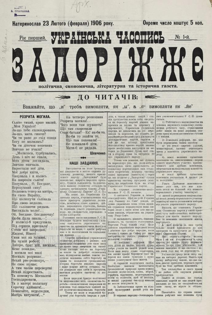 - Запоріжжє. Українська часопись: відповідальний редактор професор Д. И. Эварніцкій, видавець В. Н. Хренніков – Катеринослав, 1906. [Насправді газету видавав Микола Міхновський].