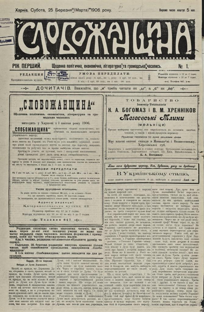 - Слобожанщина. Редактор-видавець М. Міхновський. Вміщено оголошення про скорочене зразкове число через непорозуміння з друкарнею. – Харків, 1906.