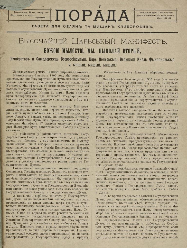 24 листопада 1905 р. вийшли «Тимчасові правила про друк» (Див. публікацію «Действия правительства. Именной высочайший указ Правительствующему Сенату» // Правительственный вестник. – Санкт-Петербург, 1905. – № 255 (26-го ноября (9-го) декабря). – С. 1). Цим документом дозволялося видавати періодичні видання в будь-яких місцях імперії російським підданим віком від 25-ти років, що мали громадянську дієздатність і не підлягали під умови «вказані в статті 7 положення про вибори в Державну Думу». Для цього слід було подати місцевому губернатору чи градоначальнику (за належністю) заяву, що мала містити: