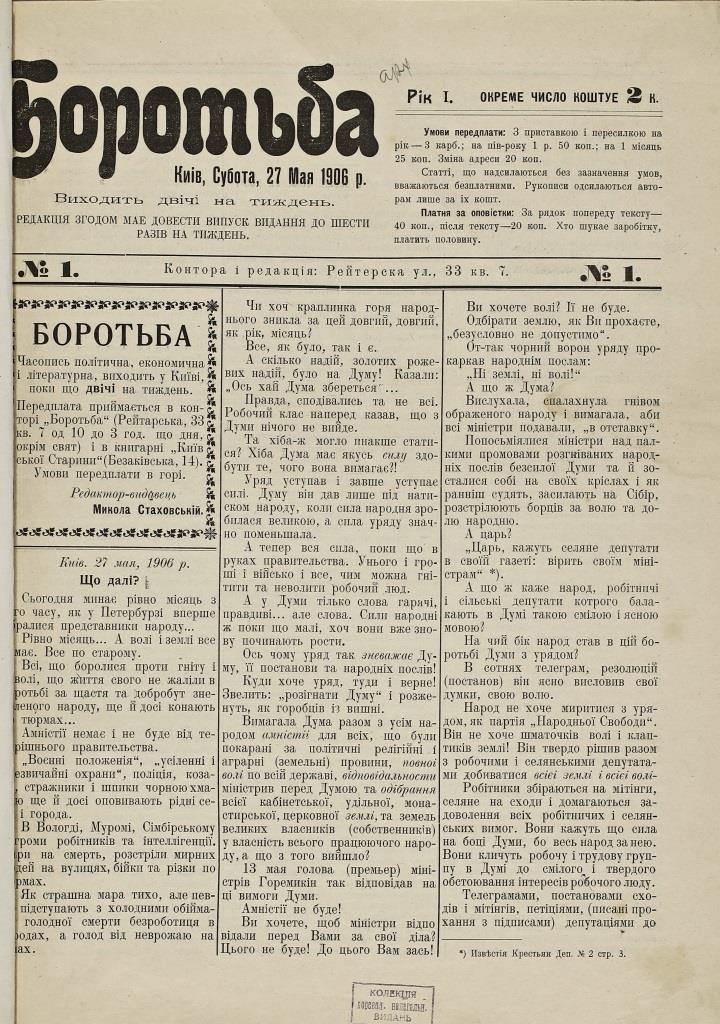 - Боротьба. Редактор-видавець Микола Стаховській. – Київ, 1906.