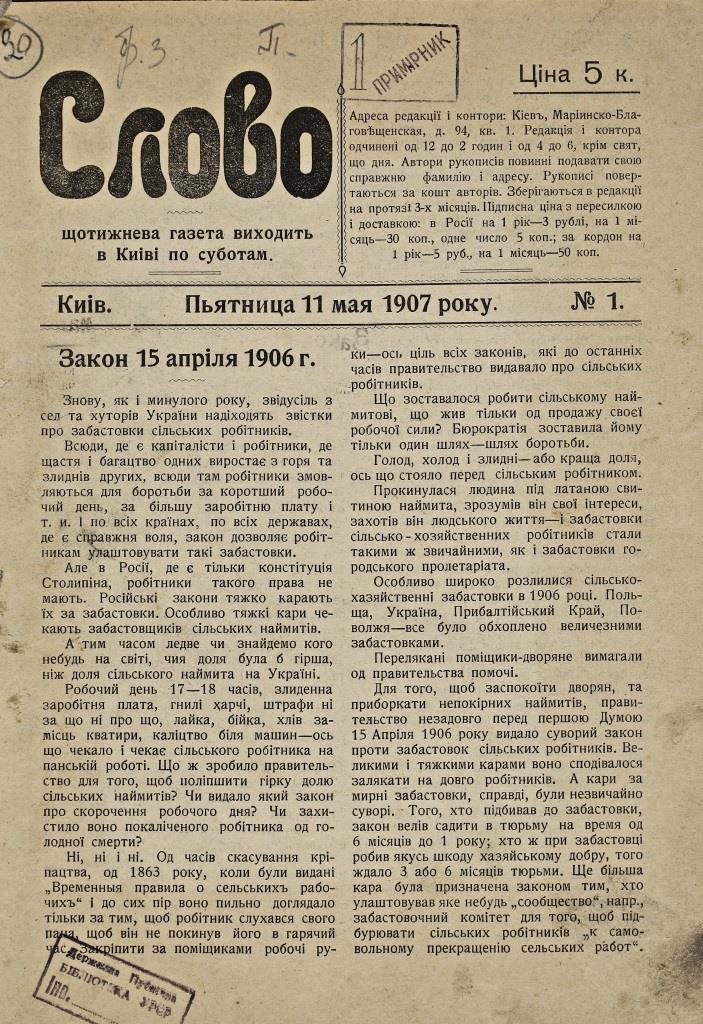 - Слово. Ред. М. Павловський, з № 2 1907 р. – О. Корольова. – Київ, 1907–1909. [Активно з газетою співпрацював Симон Петлюра].