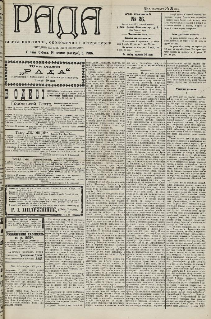 - Рада. Видавці – Б. Грінченко (до № 65 1906 р.), Є. Чикаленко. – Київ, 1906–1914.