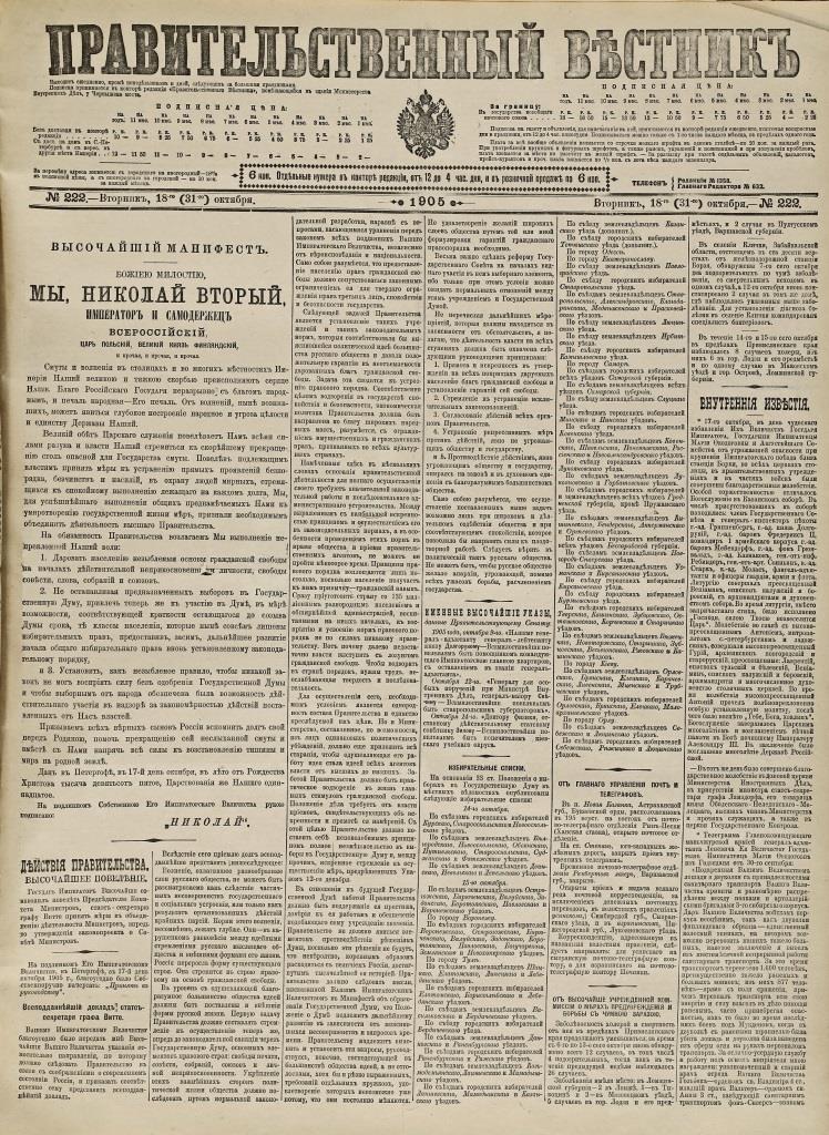 - Высочайший манифестъ // Правительственный вестникъ. – Санктъ-Петербургъ, 1905. – № 222 (18 (31 октября)). – С. 1.