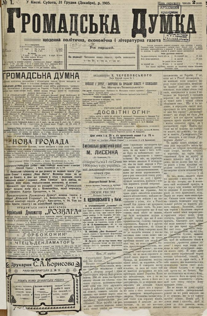 - Громадська думка. Видає і за редакцію відповідає Володимир Леонтович. – Київ, 1905–1906.